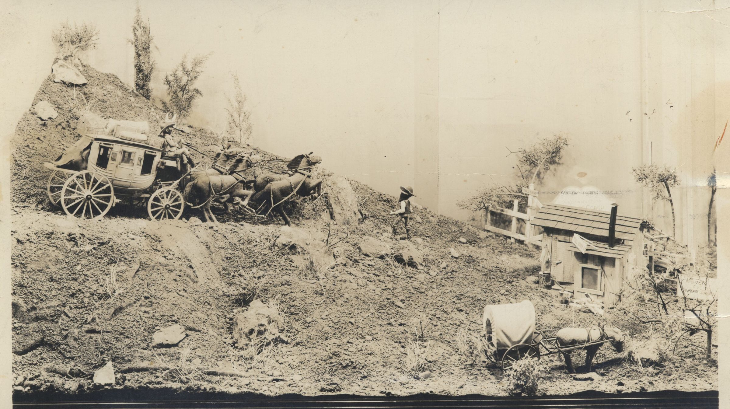 Fiesta Window Display depicting bandit holding up the stage on Los Gatos-Santa Cruz Road. Building at right is toll house. The display was created by Mel Shore. SHU018Collection