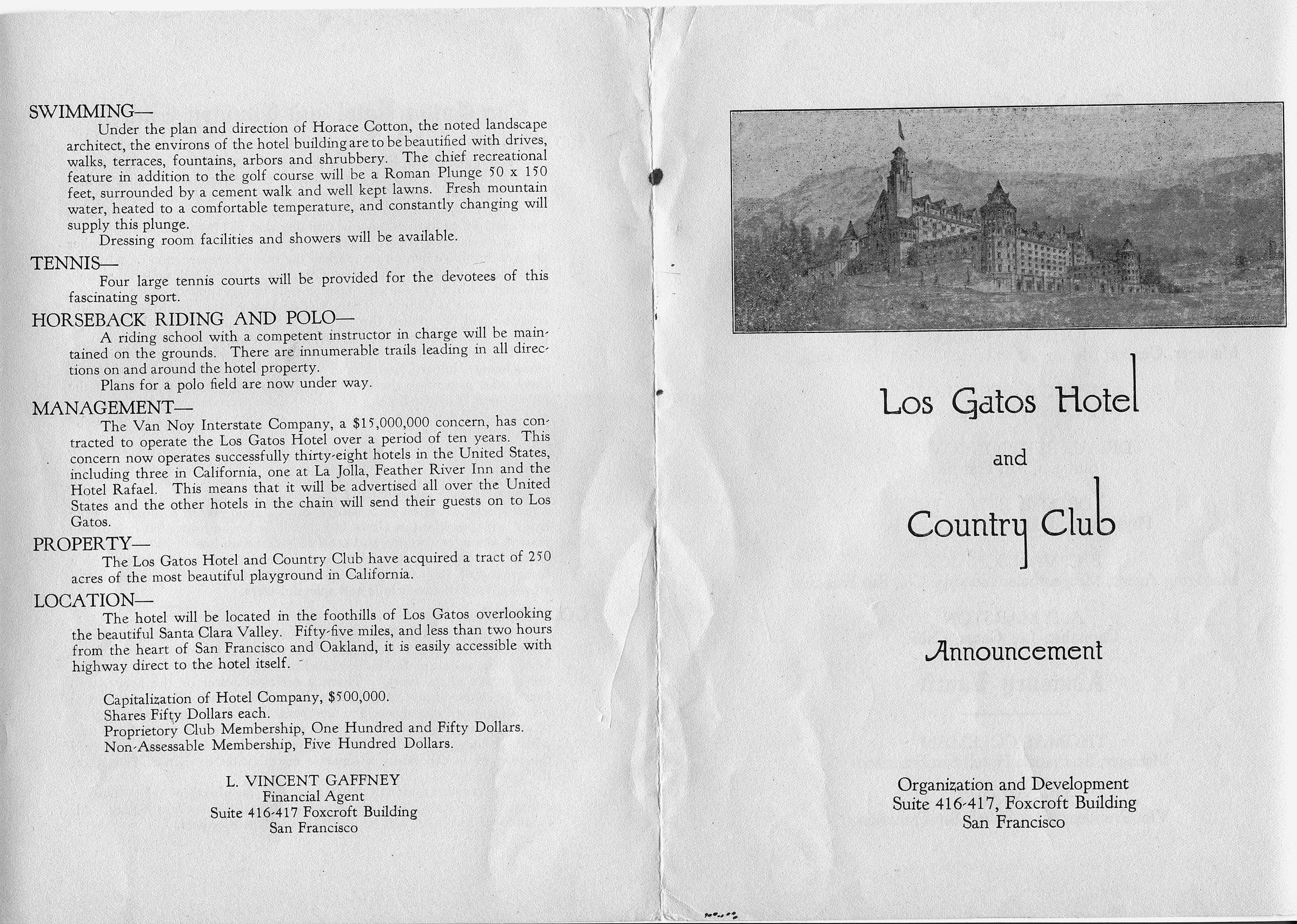 This brochure explains plans for a stately hotel and country club to be built in Los Gatos. The project was never built FAR027.Collection