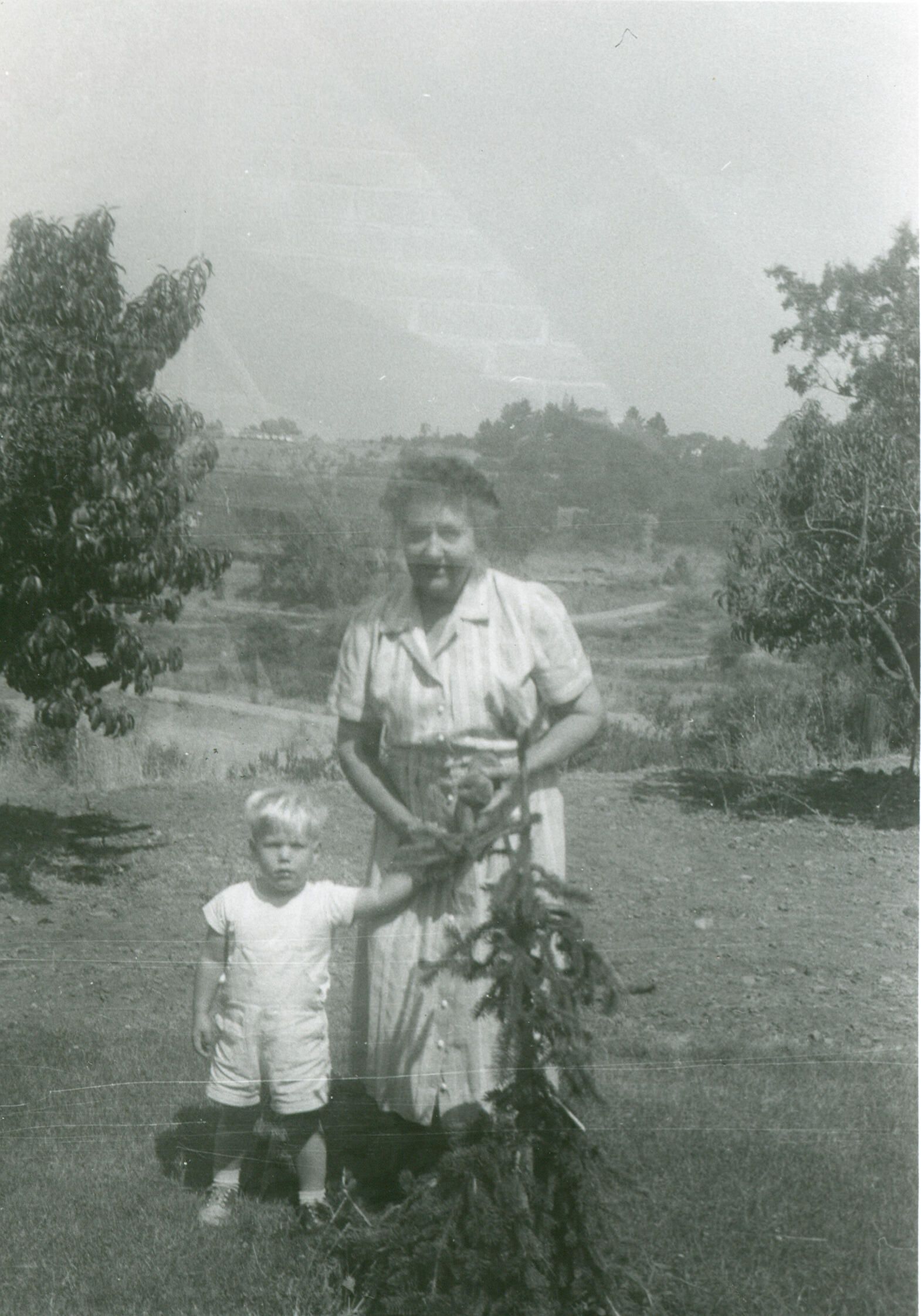 Louise Bergtold and her grandson, Phillip Bergtold, on the Bergtold Ranch. (Placer Oaks Ranch.) Vasona Dam is in the background. BGF014Collection