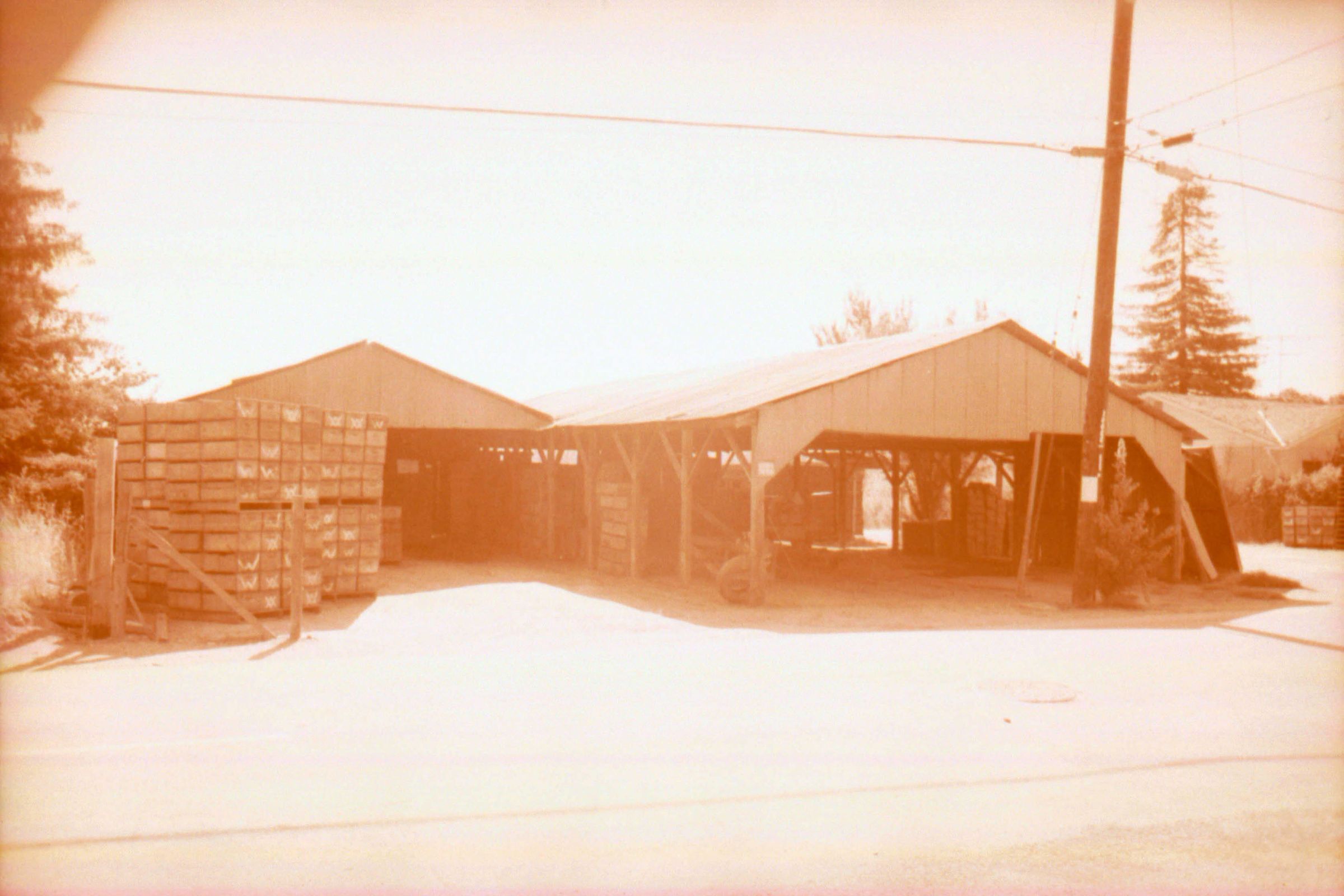 Stacks of lug boxes to the left show the containers used to put picked fruit into before the tote bins were developed. Because fruit damages when touching wood and does not deteriorate when touching other fruit, it became obvious that the most economical containers should be larger than the original lug boxes. AG106Collection