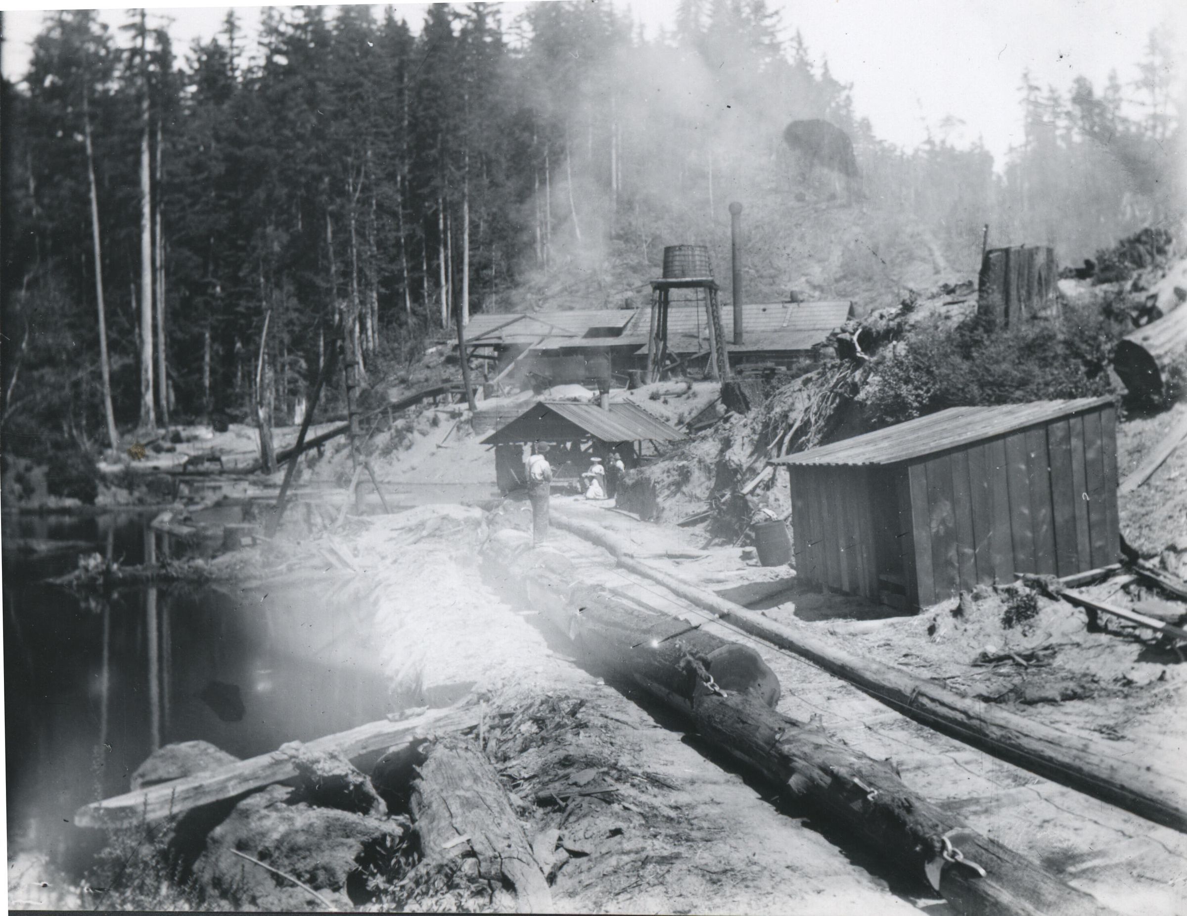 Man and two women in formal dress photographed at a lumber mill in the Santa Cruz mountains. MTN070Collection