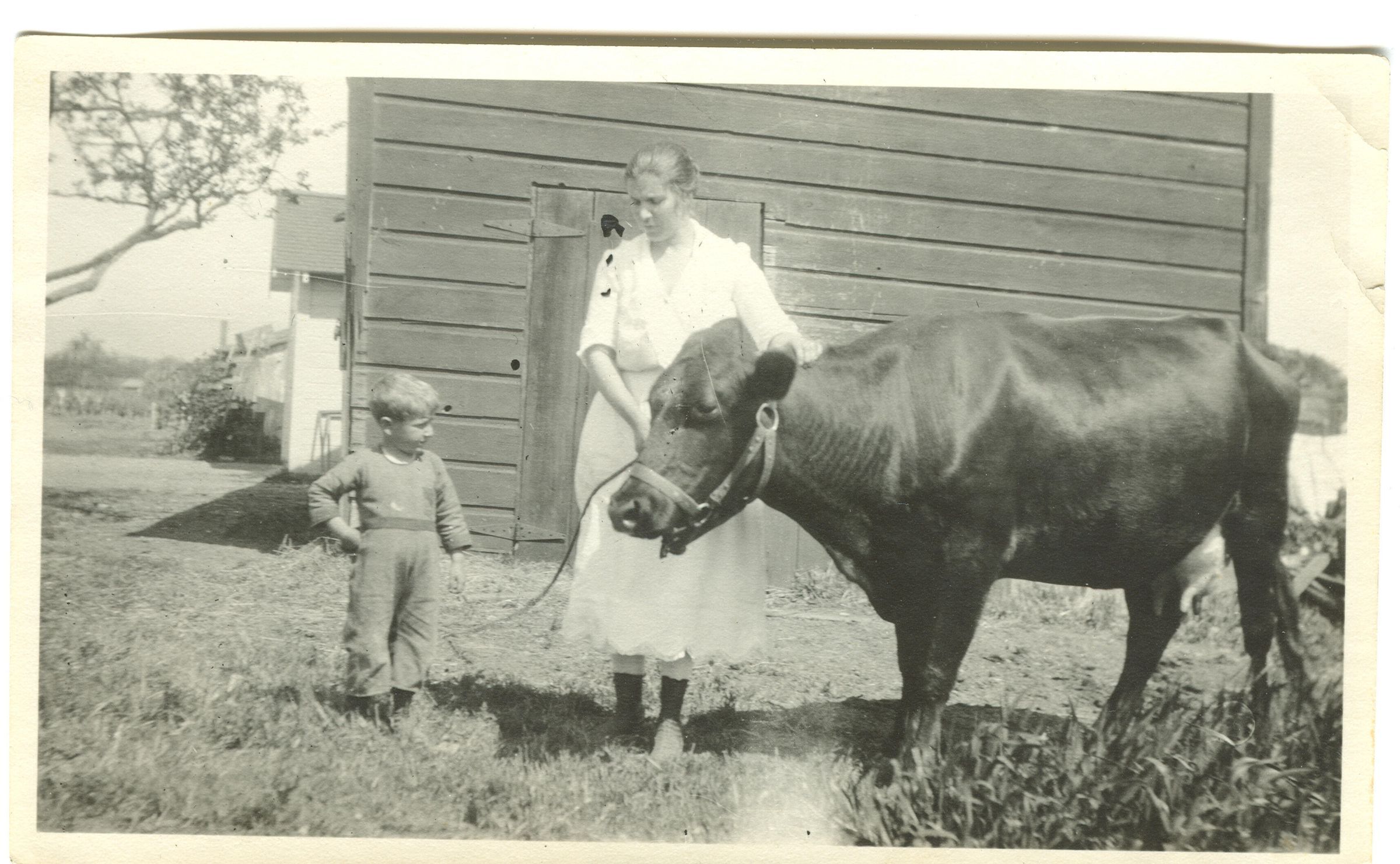 Maggie May Fink (1889-1956) and her youngest son, Lester, are shown here at the Fink Ranch on Shannon Road, circa 1925. Maggie was born in Oregon. Her mother, whose maiden name was Swanson, was from Denmark. Maggie married Victor Fink at age 16 and became the mother of seven. After milking the cow, Maggie would hurry to make dinner for her family. Their home was constructed in about 1873 by sea captain Melvin S. Gardner (1814 - 1878). Gardner bought the "Spring Creek Ranch" of 244 acres for $18,000 in gold dust, circa 1872. Gardner had come across the plains in 1849 and made a fortune in gold mining in Placer County. He planted a large almond orchard on his Shannon Road property. Victor Fink bought 27 acres of the Gardner subdivision in 1925, and the family stayed on that land until about 1940. FIN050Collection