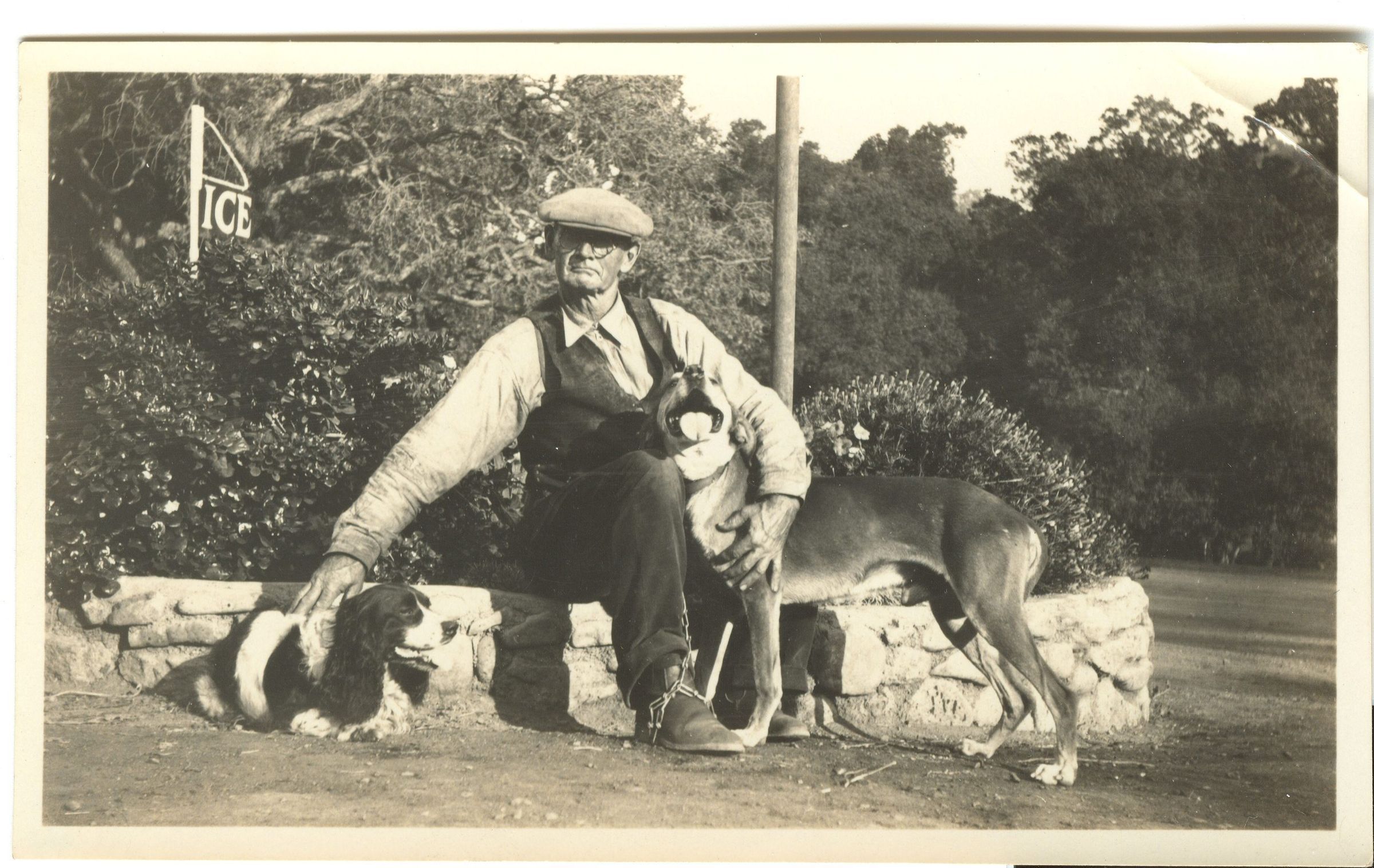 J. D. Shore and his two dogs. The dog on the left is "Rowdy." This picture was taken at 36 Park Ave., in front of the Ice House. MS012Collection