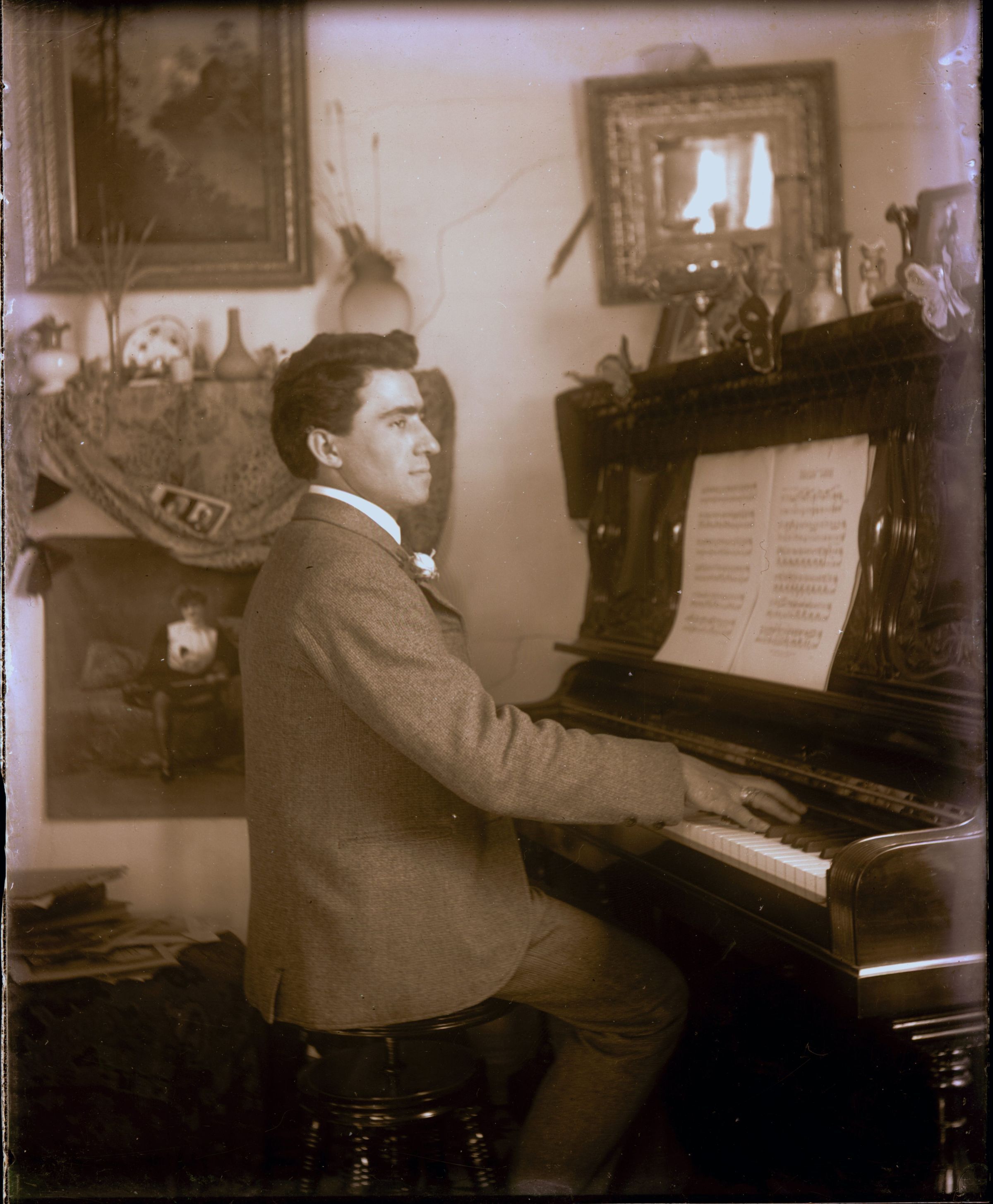 Man at very ornate piano. MUS085Collection