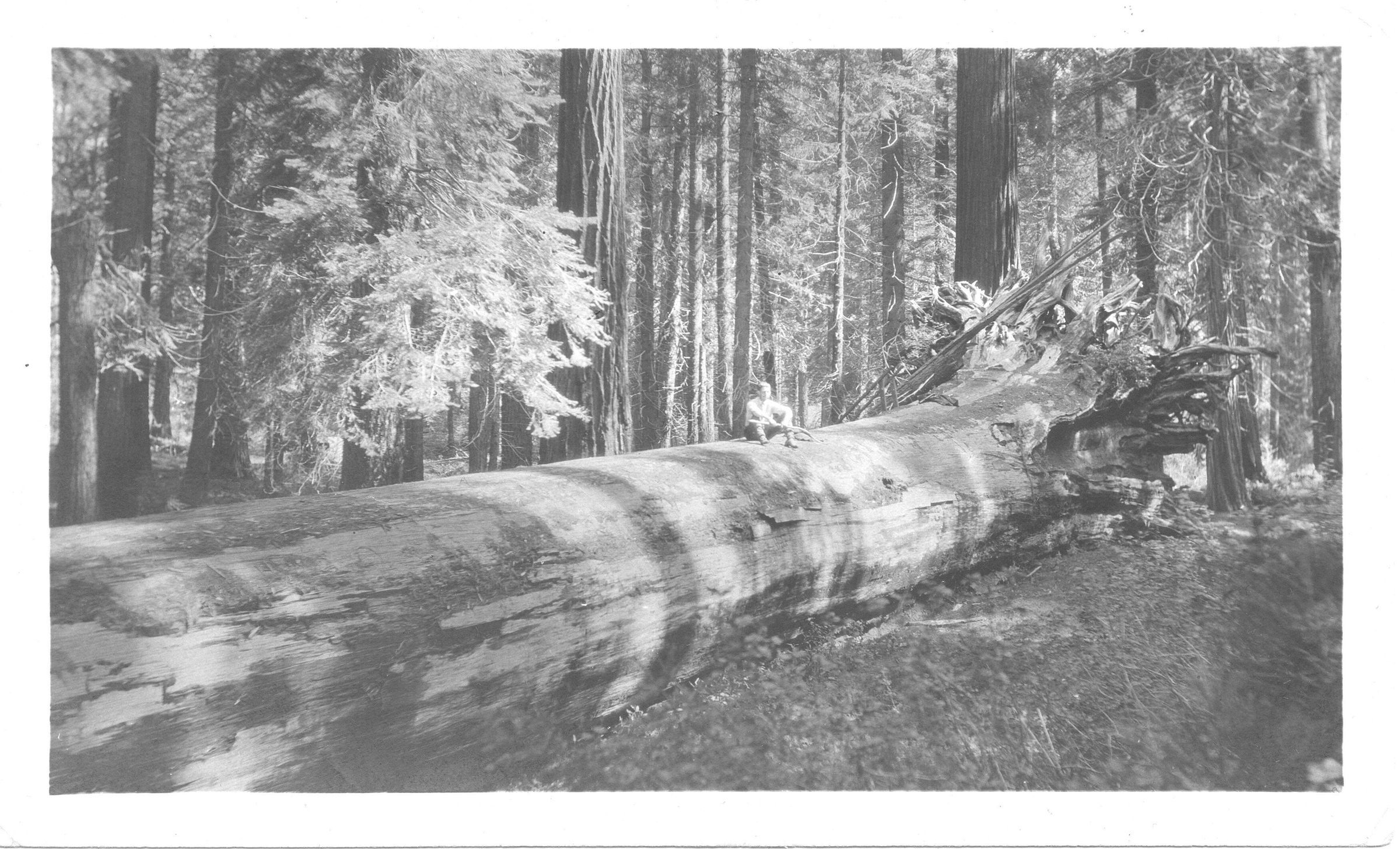 An unknown man is seated on a fallen redwood in the Santa Cruz mountains. He may have been a friend or relative of the Gonzales family. KEM020Collection