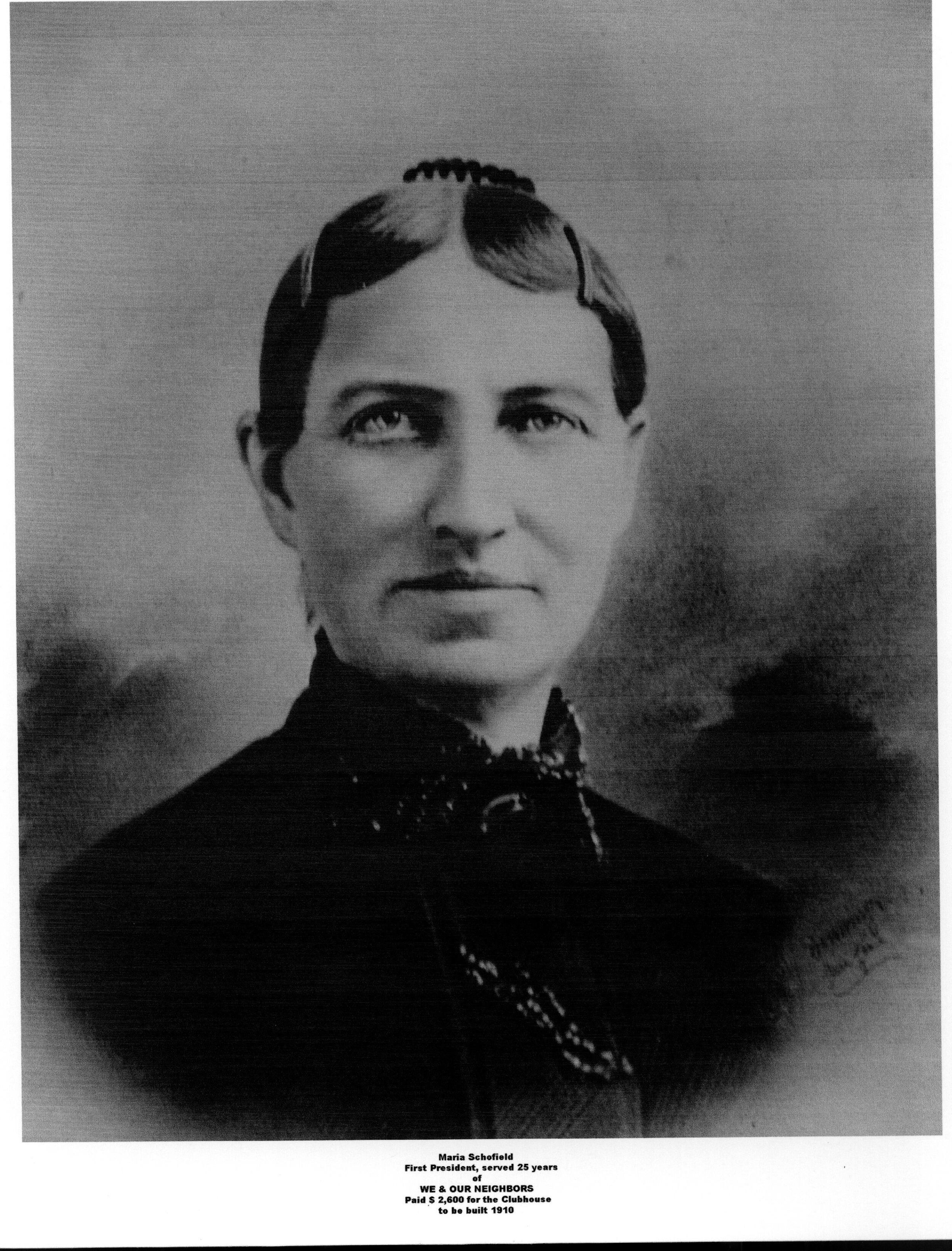 Maria Schofield was president of the "We and Our Neighbors" social club for 25 years and in 1910 she donated $2,650 to have a Craftsman bungalow built at the corner of Los Gatos-Almaden Road and Union Avenue. The land for the clubhouse was sold to the club by Sophia La Montagne for one gold dollar. WE002Collection
