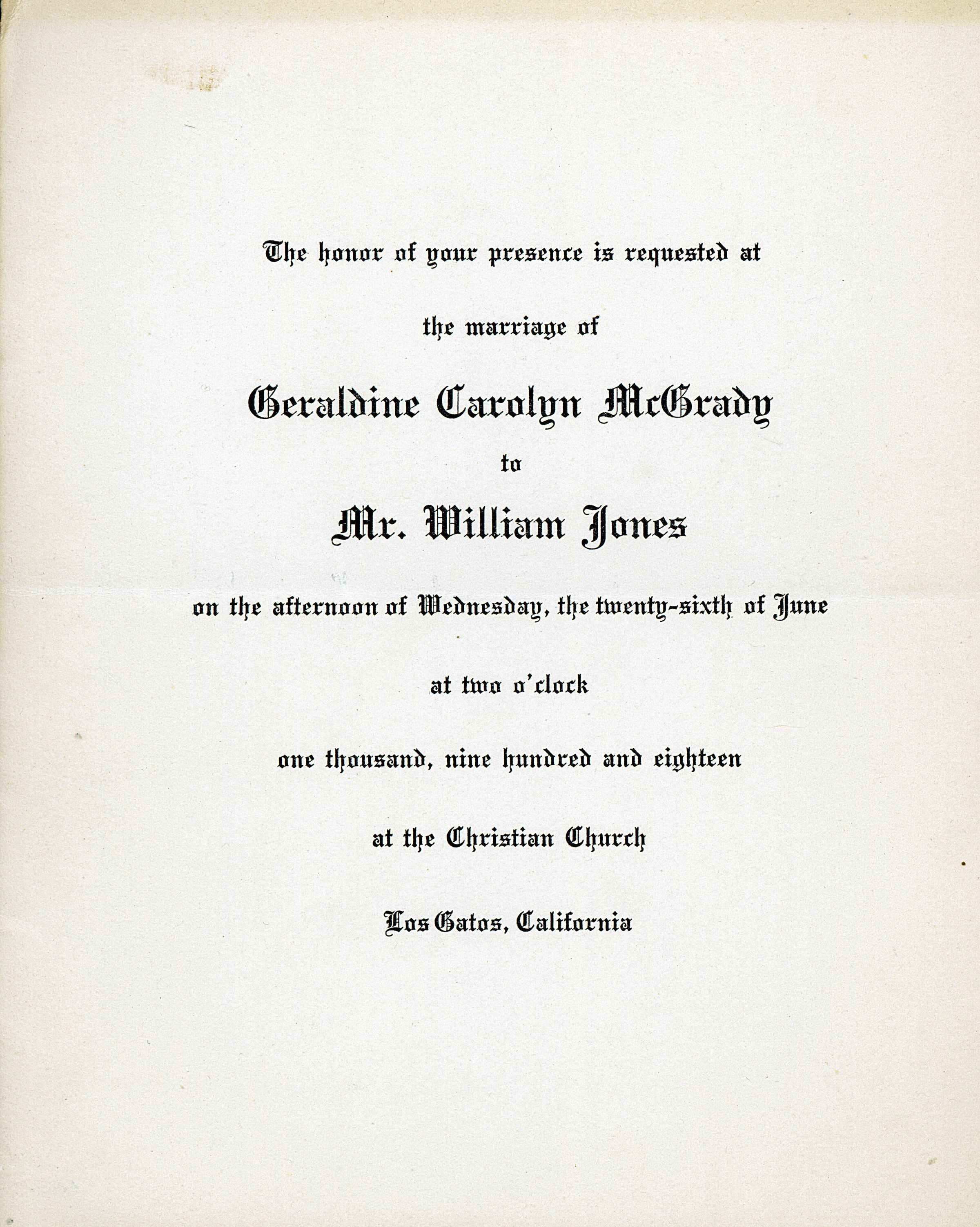 Wedding invitation to the marriage of Geraldine Carolyn McGrady and Mr. William Jones on the afternoon of Wednesday, the twenty-sixth of June, at two o'clock, 1918, at the Christian Church in Los Gatos. JON052Collection
