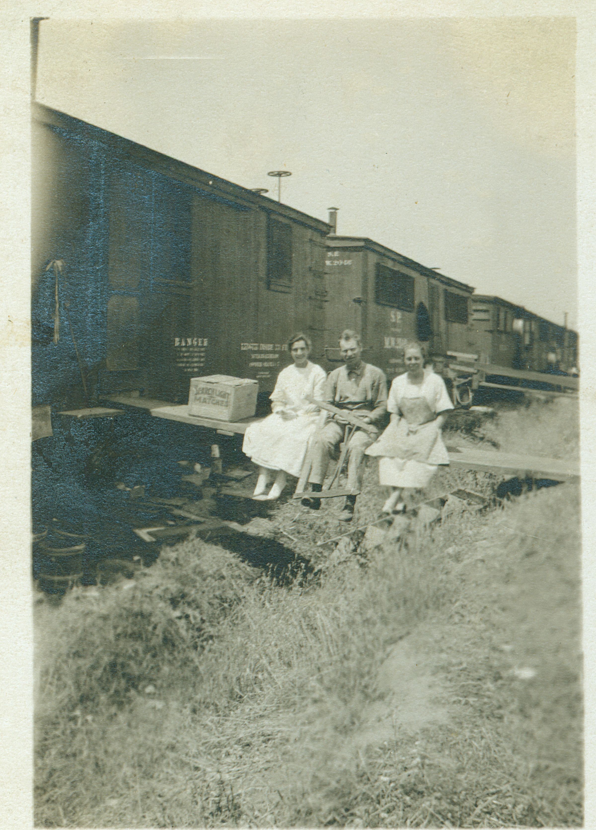 Geraldine McGrady Jones, pictured to the left of her husband Billy, began her teaching assignment at Wright's one-room schoolhouse in 1914. A 1911 graduate of Los Gatos High School, she pursued her teacher training at San Jose State Normal School (San Jose State University), commuting from her family's Los Gatos home via the Peninsular Railway. This photograph was taken soon after the 1918 wedding of Billy and Geraldine. Geraldine wrote: "We had a chance to go on a work train that pulled the Bowman Ditcher. Each member of the crew had a box car to live in. Ours was fixed up with a bedroom, living room and kitchen combination and a woodshed. Whenever the Ditcher had to be moved, the cars were connected and off we all went. On Monday mornings, Billy would bring the engine alongside the car and fill up the wash tubs with hot water and attach a line to a telephone pole." JON056Collection