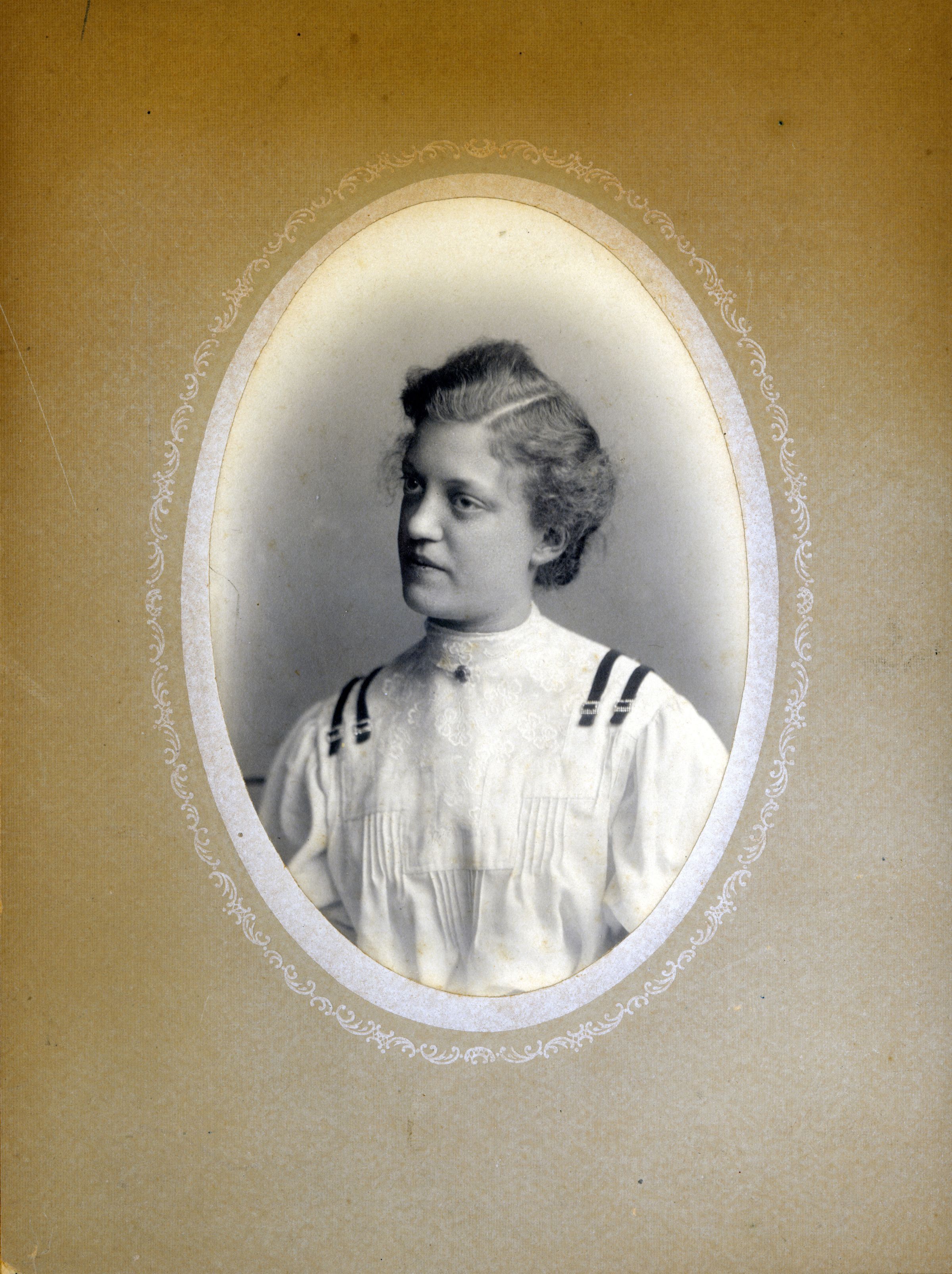 This portrait of Amy McGrady was taken in Los Gatos in December, 1906. She was attending San Jose State Normal School in 1907 when her mother, July McGrady, died after a stroke. Amy then had to stay home and look after the family. She was like a mother to her younger sisters, Geraldine and Genevieve. Amy died at age 29 of diabetes. JON054Collection