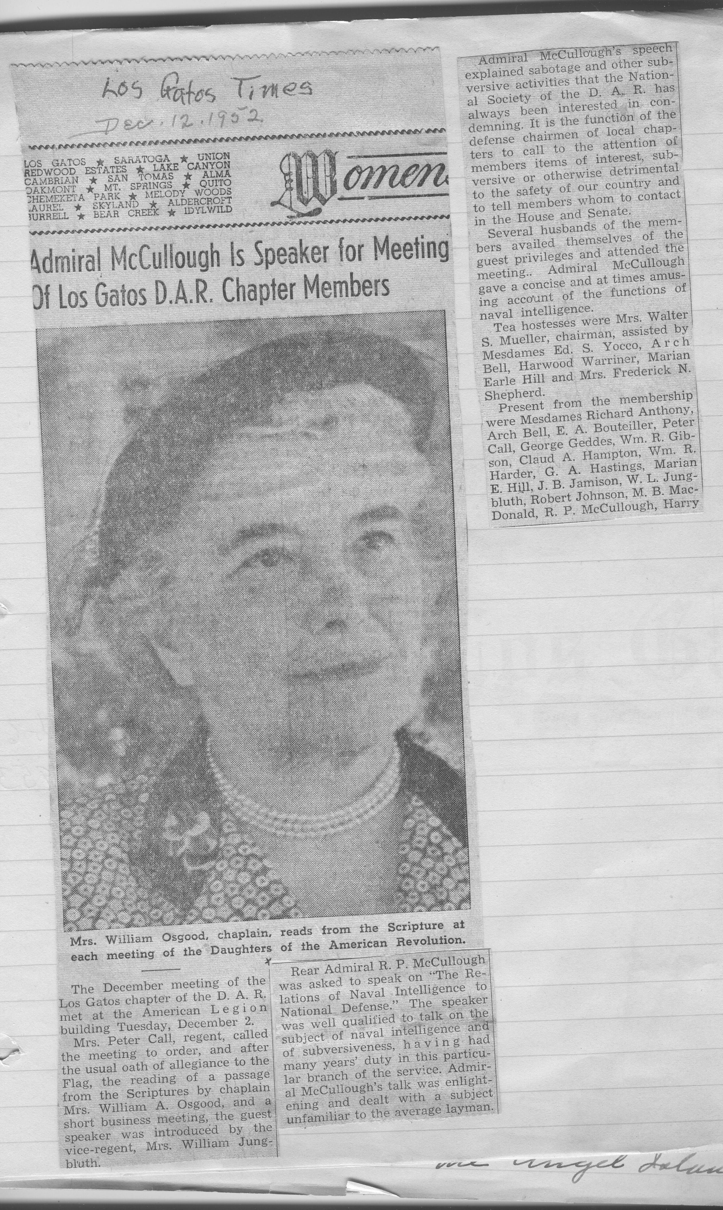 This newspaper article includes a photograph of Mrs. William Osgood, chaplain, who read from the Scripture at the opening of each D.A.R. meeting. The guest speaker at this December 12, 1952, meeting was Rear Admiral R. P. McCullough. DAR026Collection