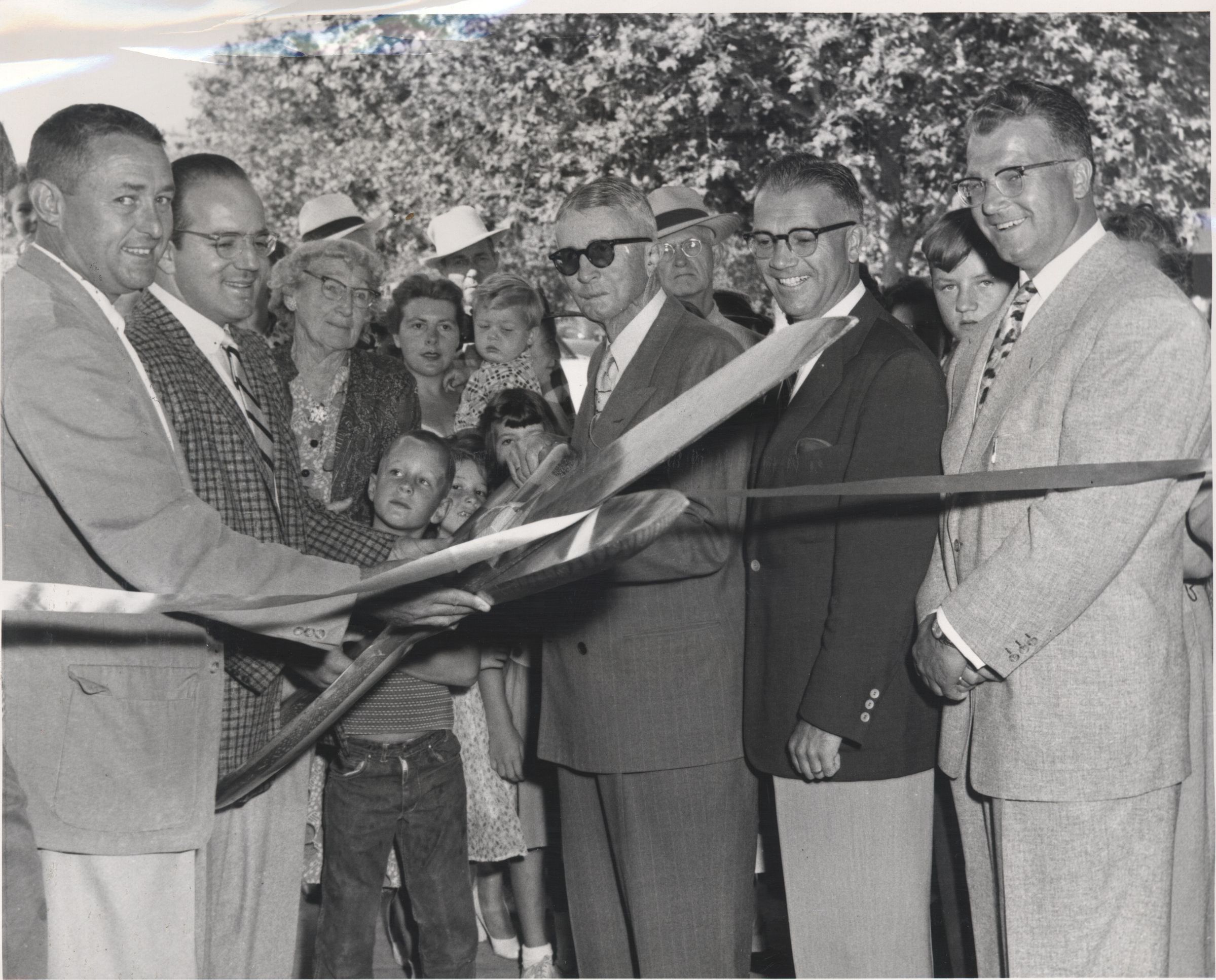 A ribbon-cutting ceremony is presided over by Mayor A. E. Merrill, standing at the center of the photograph, wearing sun glasses. Merrill was mayor of Los Gatos from 1954-1962. PE040Collection