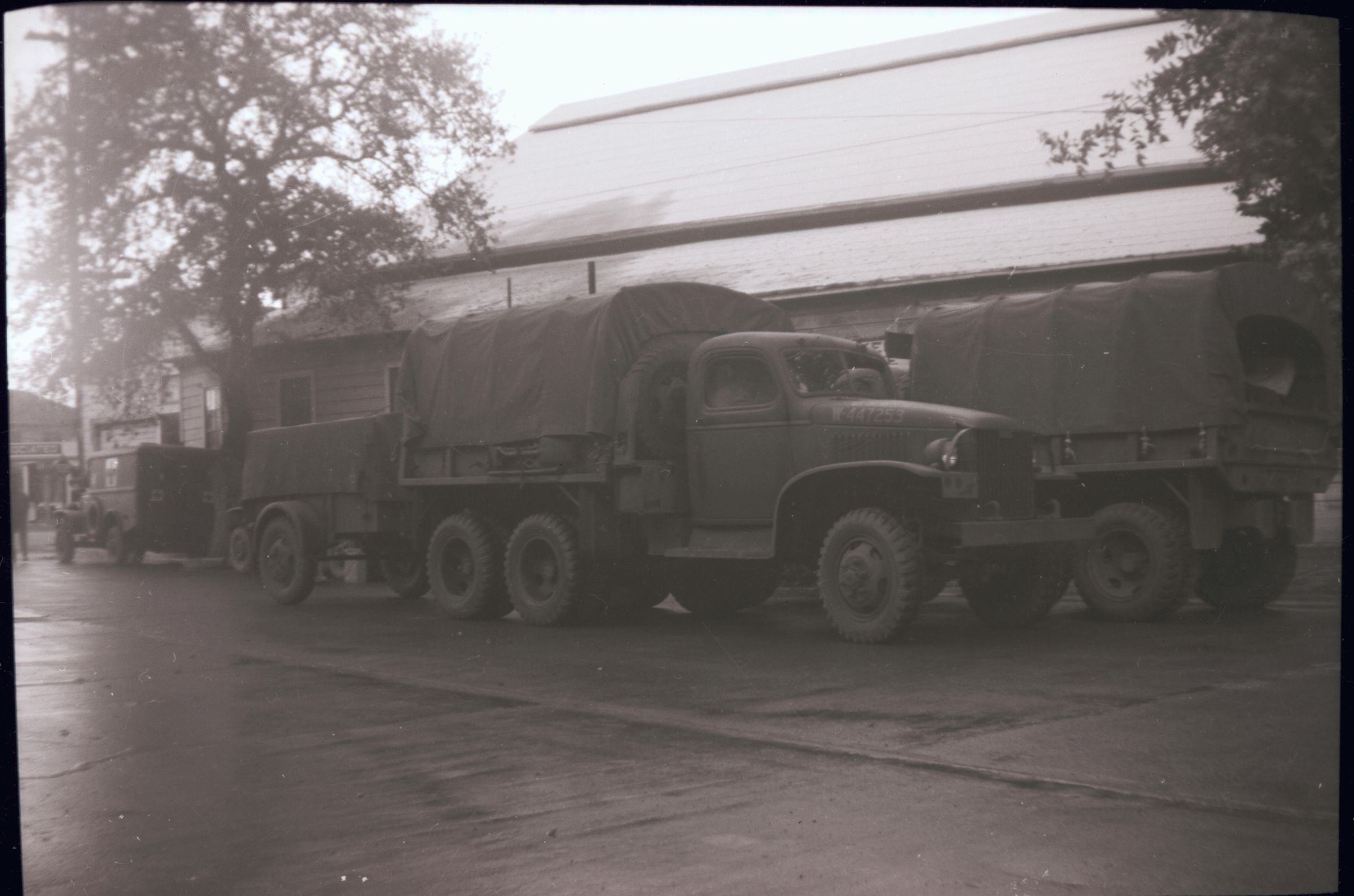 Military trucks parked in the vacant lot by the building next to Peerless Stage building. In other years, that same lot at the corner of North Santa Cruz Avenue and Royce Street served as the site where the annual carnival arrived and set up tents. SHU132Collection