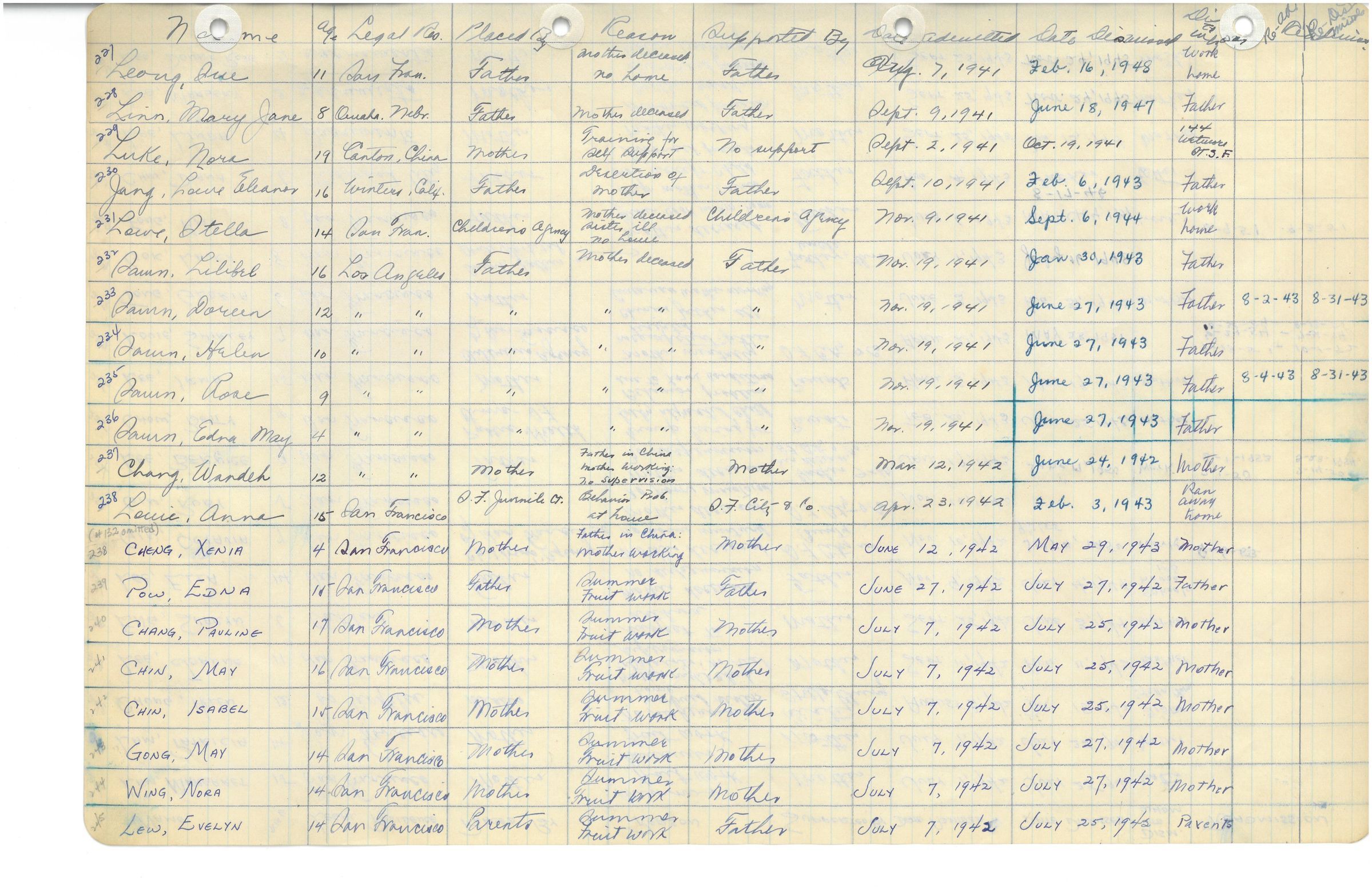 Page of Ming Quong log book which details names, origins, and reasons for moving into Ming Quong Home.Collection