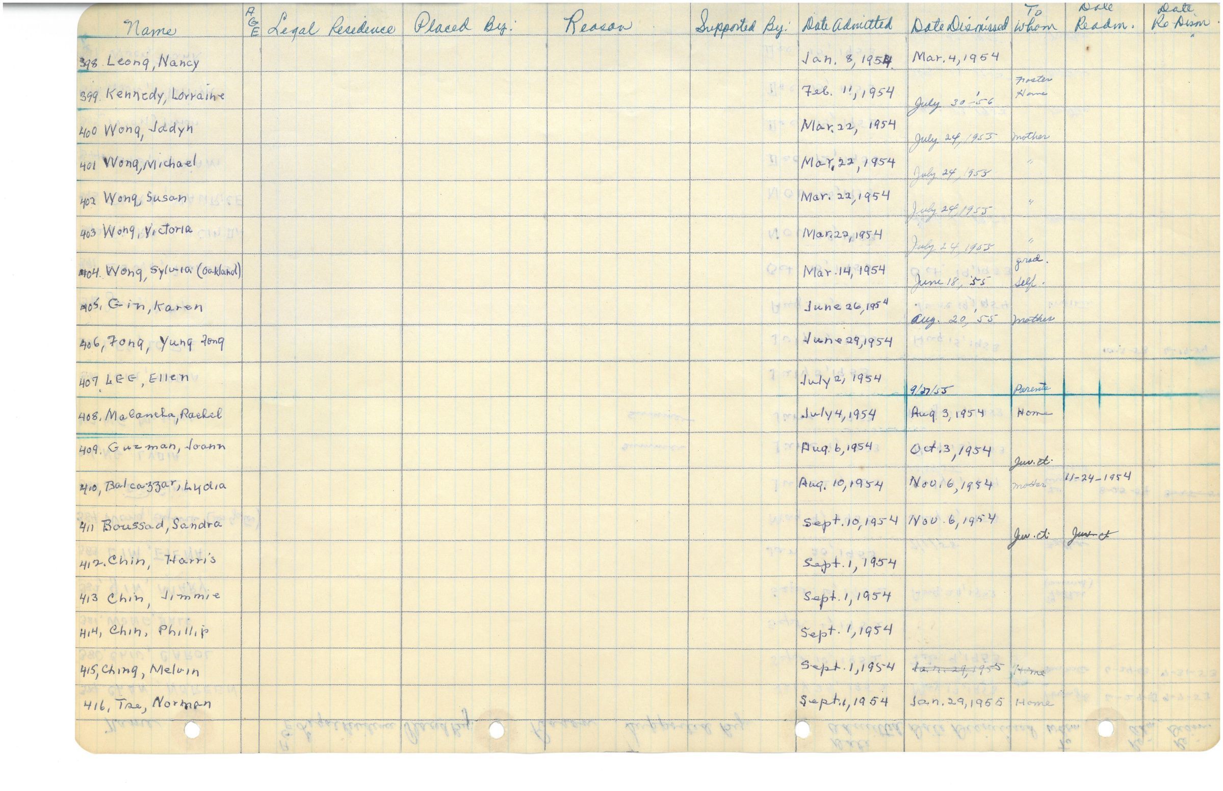 Page of Ming Quong log book which details names, origins, and reasons for moving into Ming Quong Home.Collection