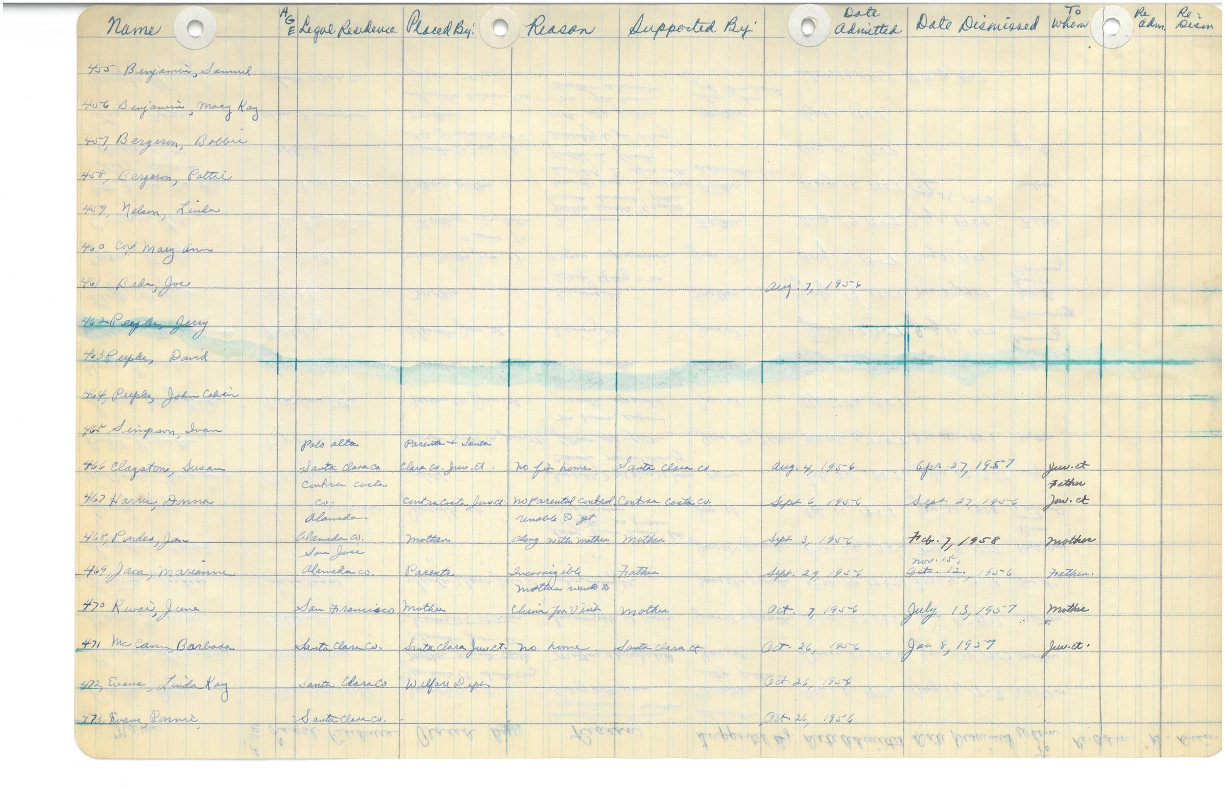 Page of Ming Quong log book which details names, origins, and reasons for moving into Ming Quong Home.Collection