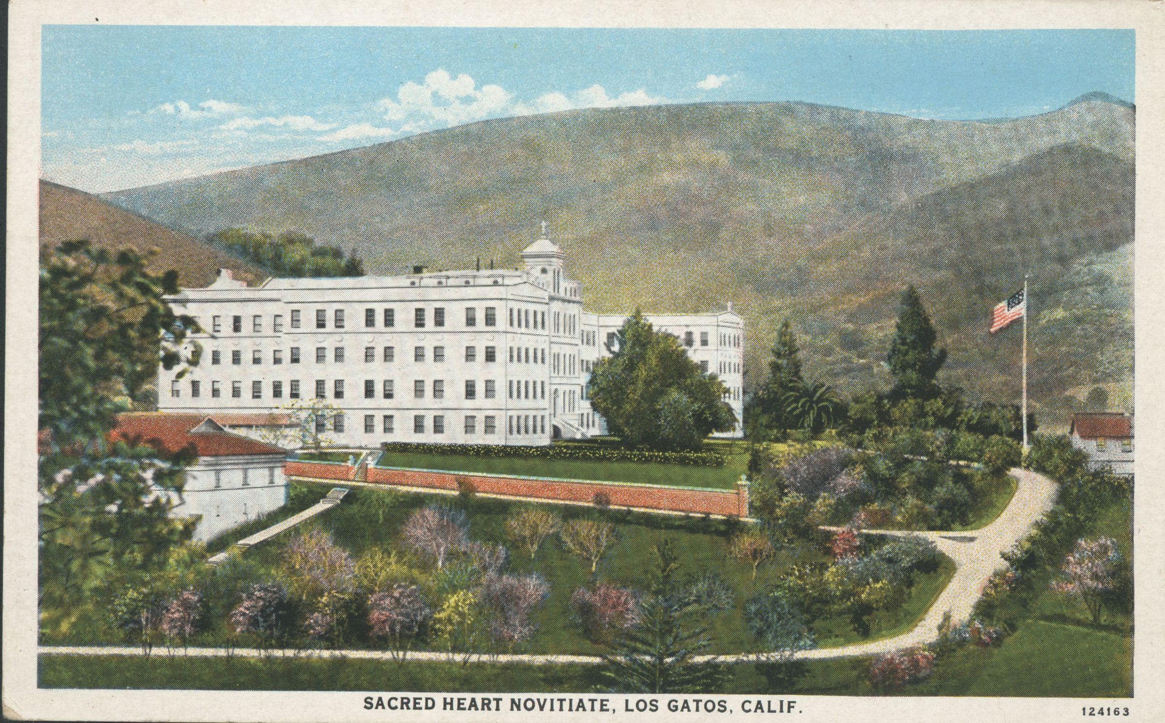 In 1914 a building program was initiated and in 1926 a Novitiate wing and a Juniorate wing were added. This view is toward the west with a portion of the orchards in the foreground and the Los Gatos hills in the background. NOV005Subject