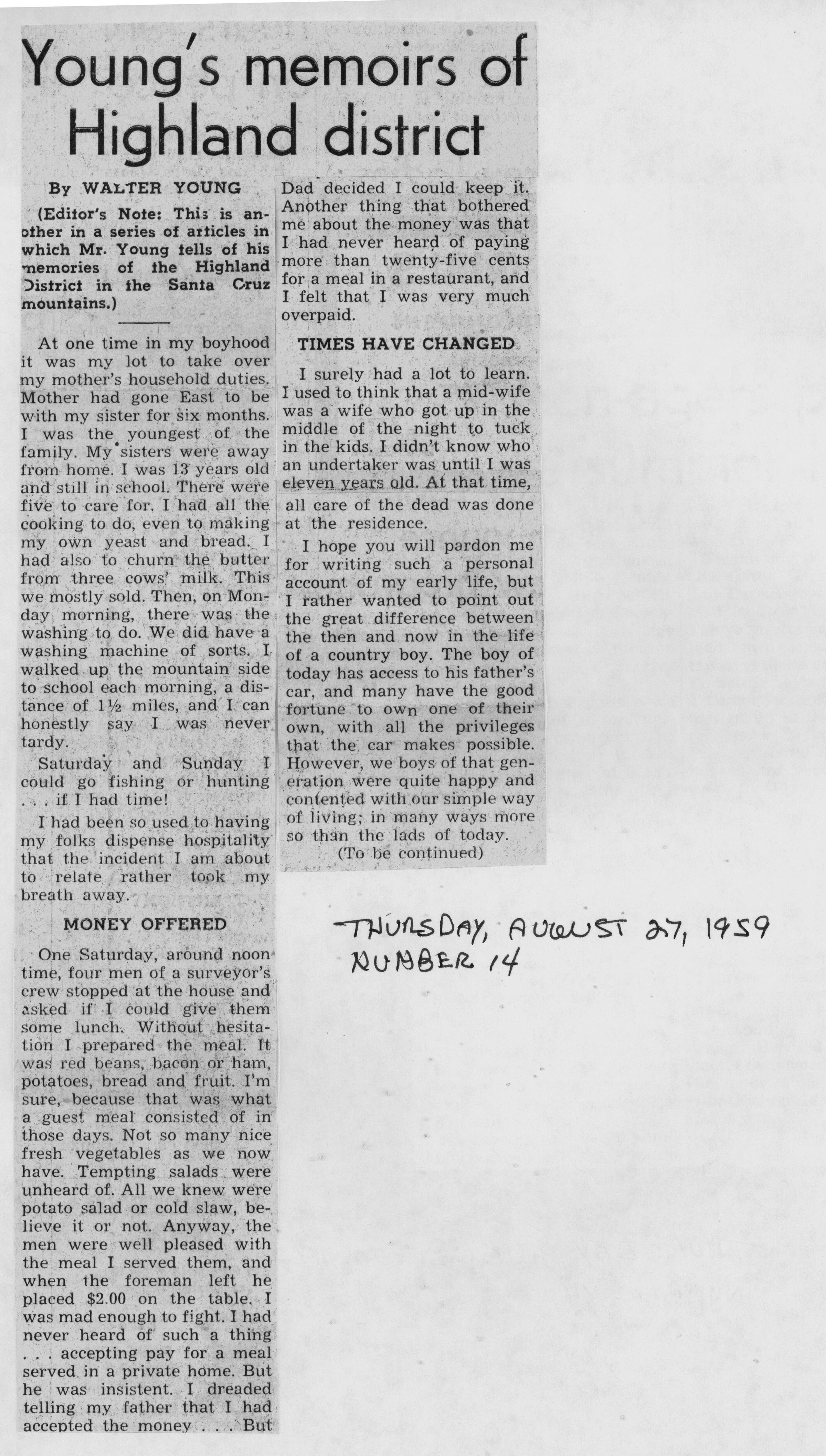 Another of Walter Young's articles reminiscing about his boyhood in the Santa Cruz Mountains. This appeared in the August 27, 1959 Los Gatos Times Observer. WIL022Collection