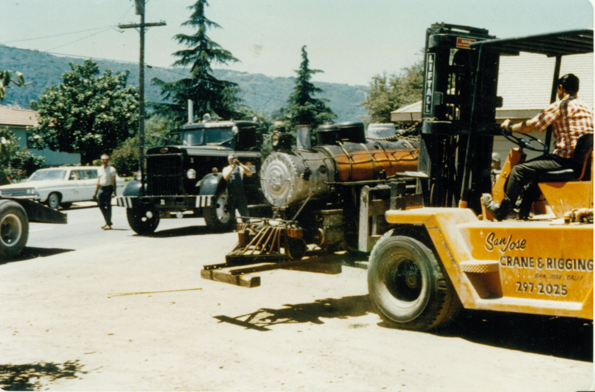 After Billy Jones died, and his property was to be subdivided, the Los Gatos Jaycees offered to purchase the 2-Spot and passenger cars if the town provided both a place for operations and a small subsidy for maintenance costs. The decision was made to relocate the line to Oak Meadow and neighboring Vasona parks. Here, the 2-Spot is being loaded for the short trip to its new home. JON084Collection