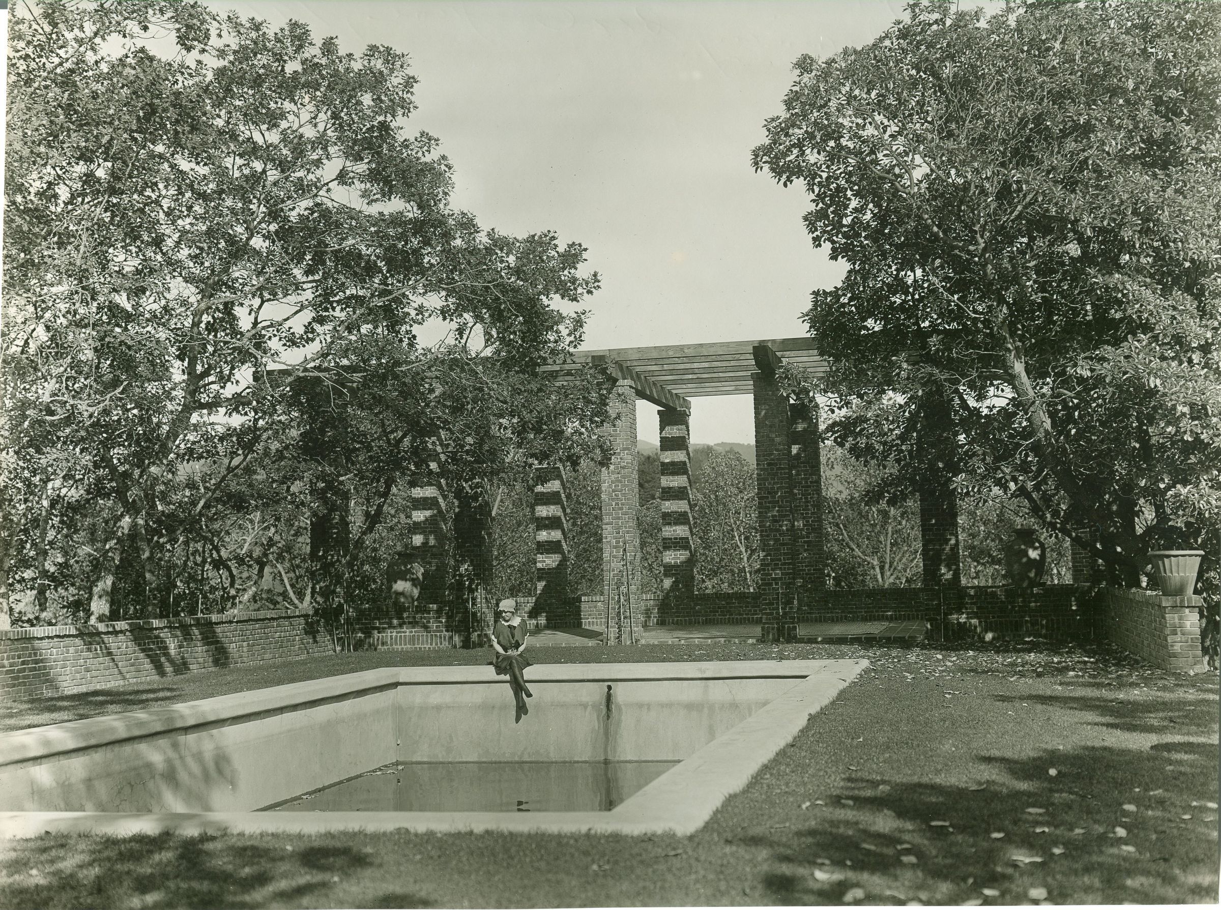 Mrs. Haupt at the original pool at Tevis Estate. It became a sand box and then a lily pond. NVC017Collection