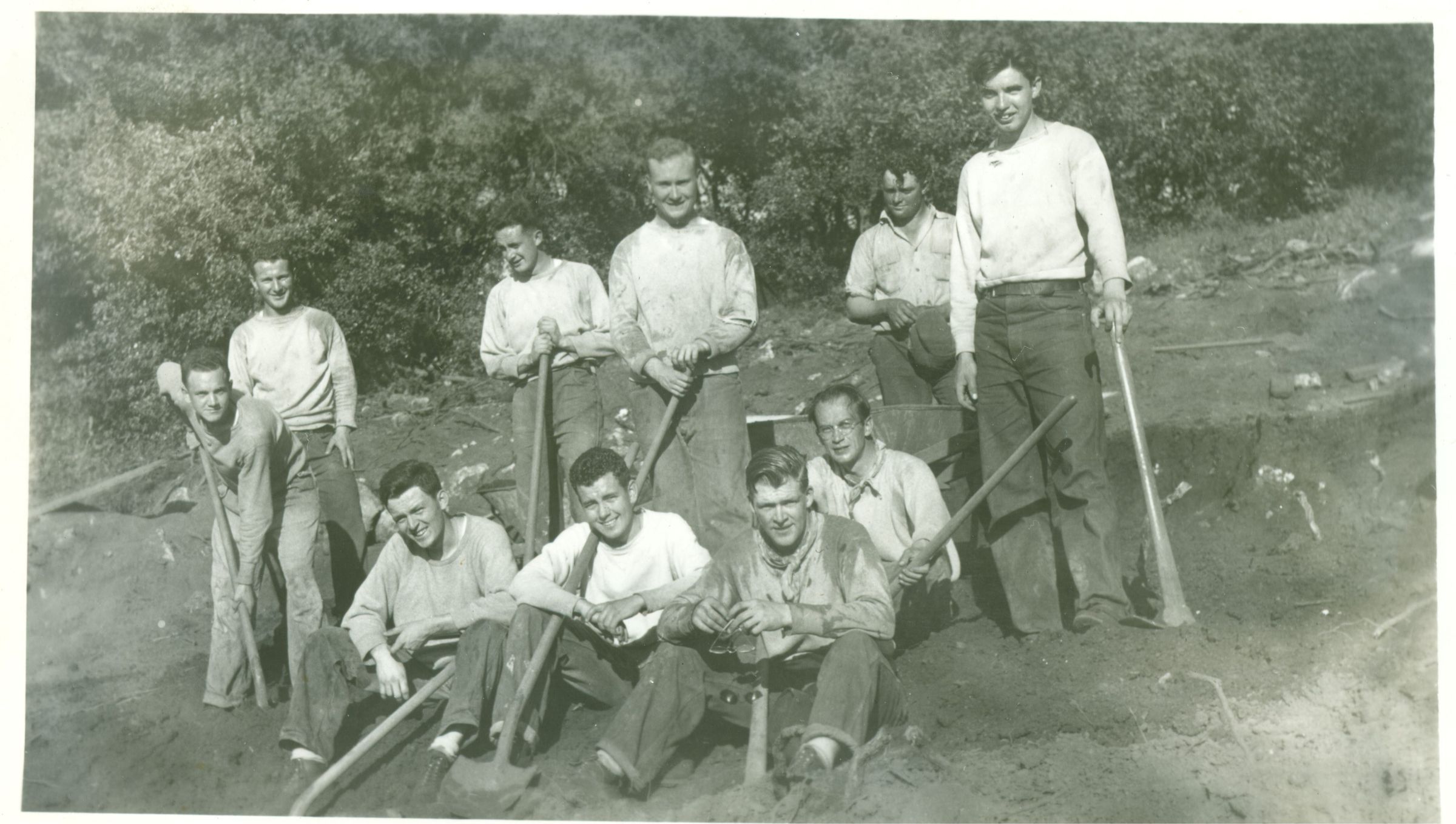 Novices working on baseball field at Novitiate of the Sacred Heart, Los Gatos, March 16, 1939. 1893-1962 "Dutch Francis Seeliger Master of Novices" was something of a frustrated engineer. Novices always had projects. Juniors spent more time studying. NVC055Collection