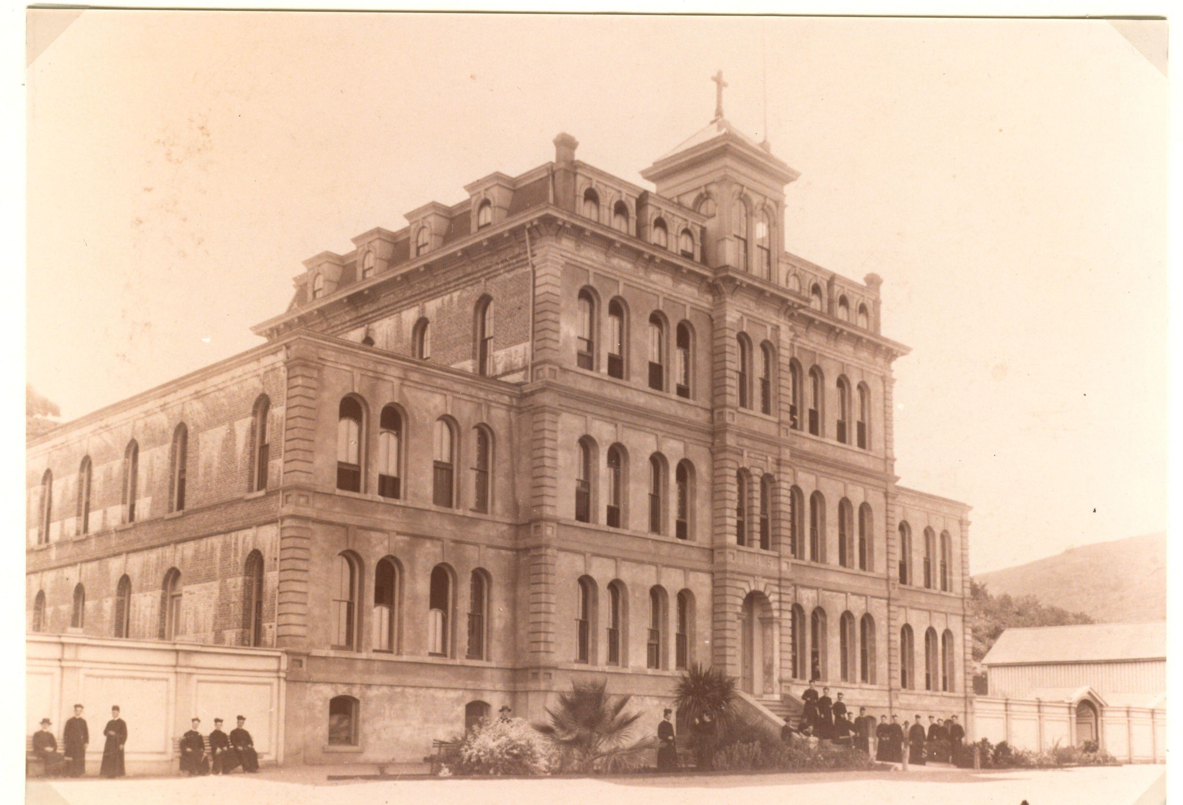 The Novitiate of the Sacred Heart built in 1887-1888 with priests standing in front. NVC024Collection