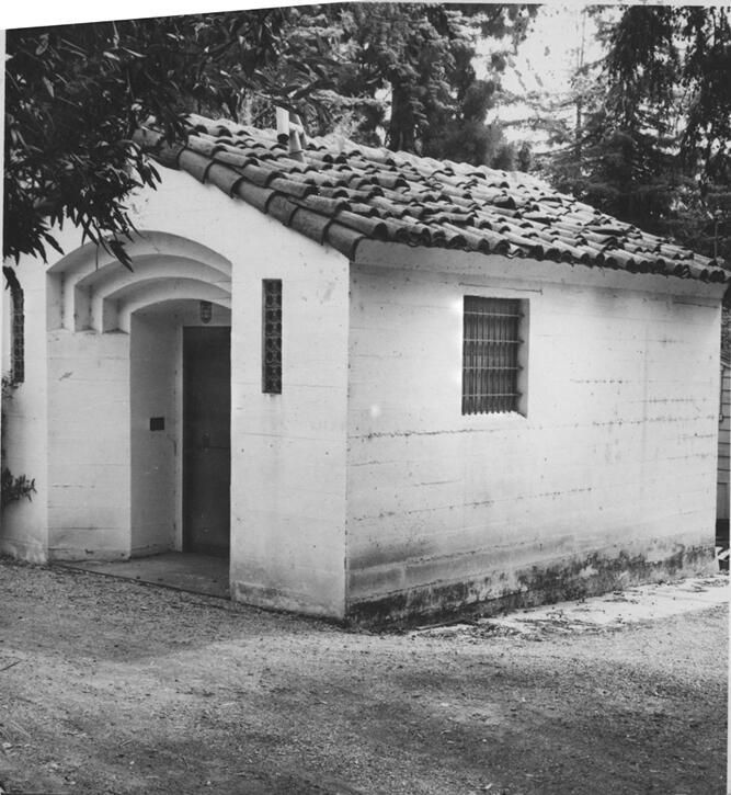 The "sweatbox" jail that so briefly held Incarnation Garcia in 1883 burned down in 1896. This two-room accommodation, which faced Pageant Way and served from 1934 - 1965, was constructed mostly to care for "the drunks arriving on the late cars" at the railroad station. Because of their condition, they couldn't be taken to their homes, and the county jail was too far away. It also served as a holding cell for minor infractions. Children sometimes peeked through the bars of this little jail to "see the bad guys." LAW001Collection