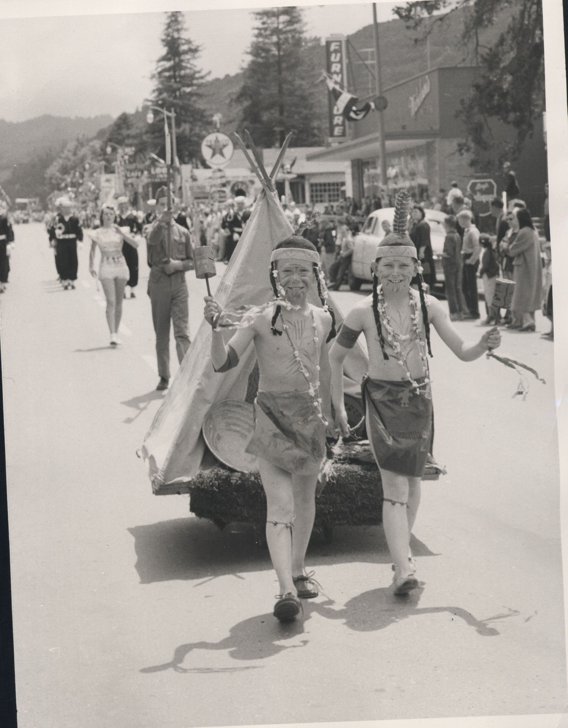 These two "Indian braves" pulled along their tepee in the 1957 Los Gatos Fiesta Parade. At left is Barney Sheridan; on the right, David Shuman. SHU045Collection