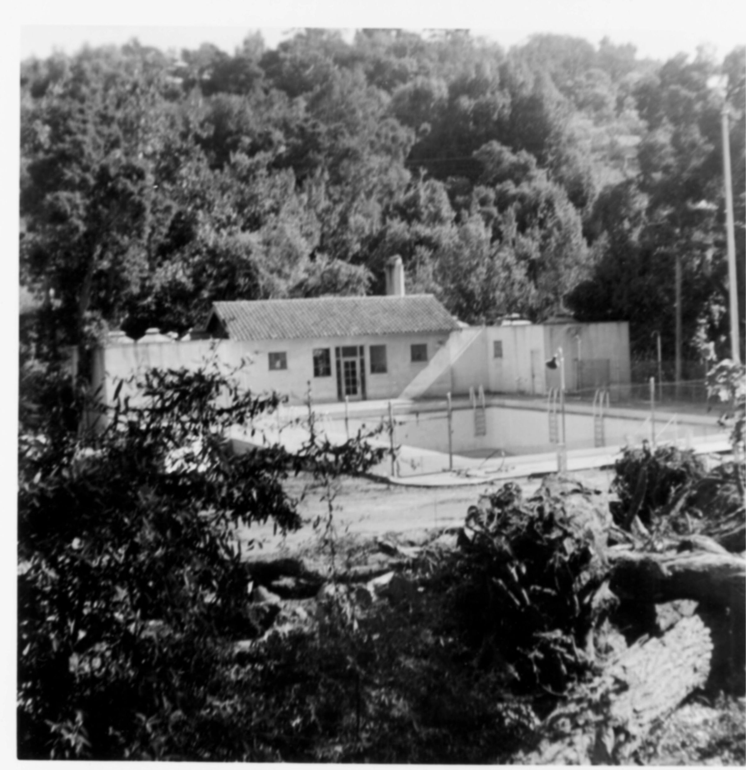 Lena Barbieri Conley took this photograph of the town's swimming pool not long before it was demolished in 1954, to make way for the freeway. It had opened in 1927 in Memorial Park, where Highway 17 now runs. Before the pool was built, the boys of the village liked to walk up to a wide spot in Los Gatos Creek which they called the BooGang. It provided a place to swim and catch crayfish on hot summer days.Collection