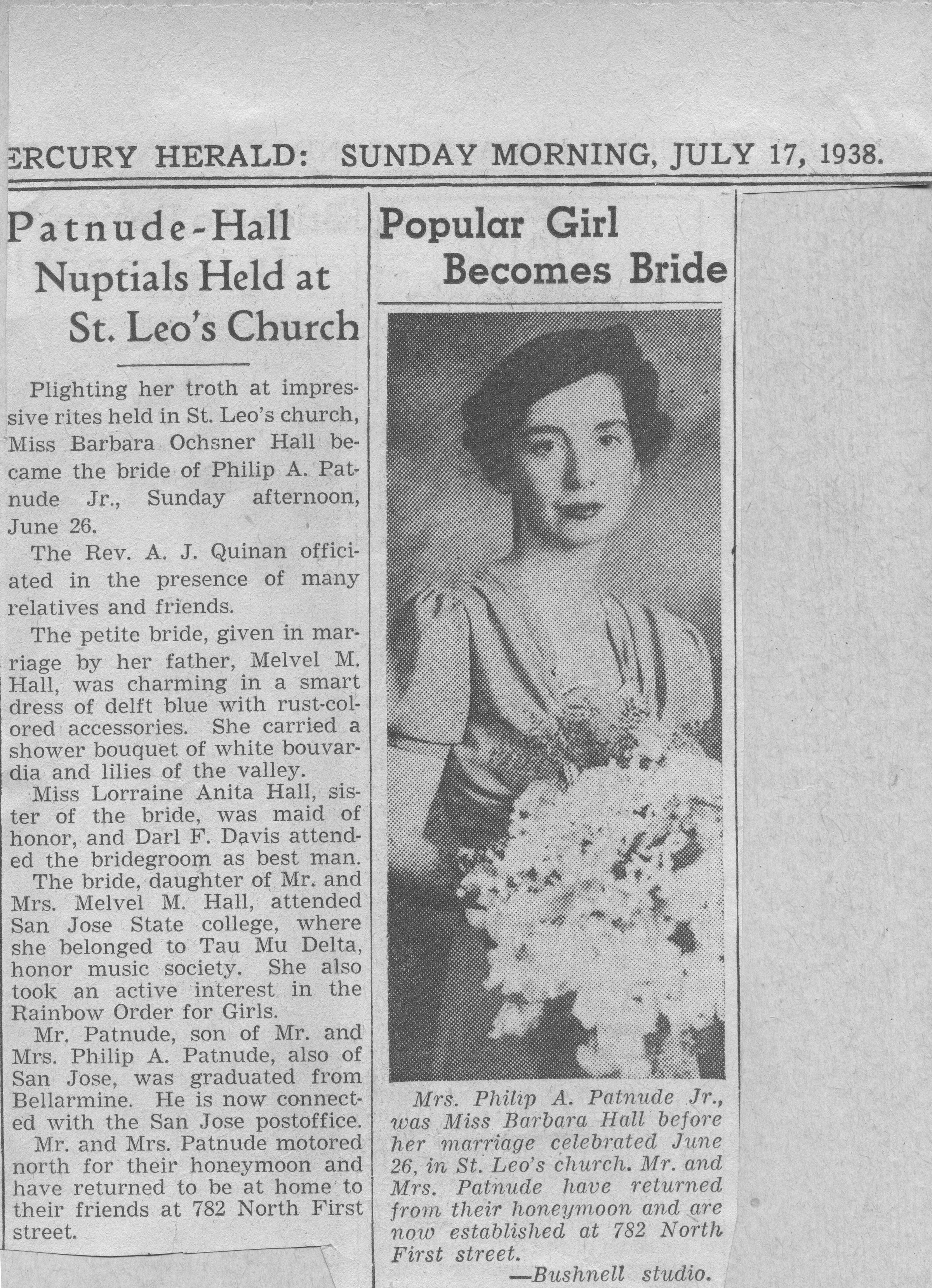 San Jose Mercury Herald July 17, 1938 Newspaper article, "Patnude-Hall Nuptials Held at St. Leo's Church." Barbara O. Hall, the bride, was the second child born to Melvel H. Hall and his wife Laura. Her siblings were Lorraine, Roger and Melita, all great-great grandchildren of Jose and Gertrudis Hernandez. The family often remarked that Barbara bore a resemblence to her great-grandmother, Maria Francisca Hernandez. KEM010Collection