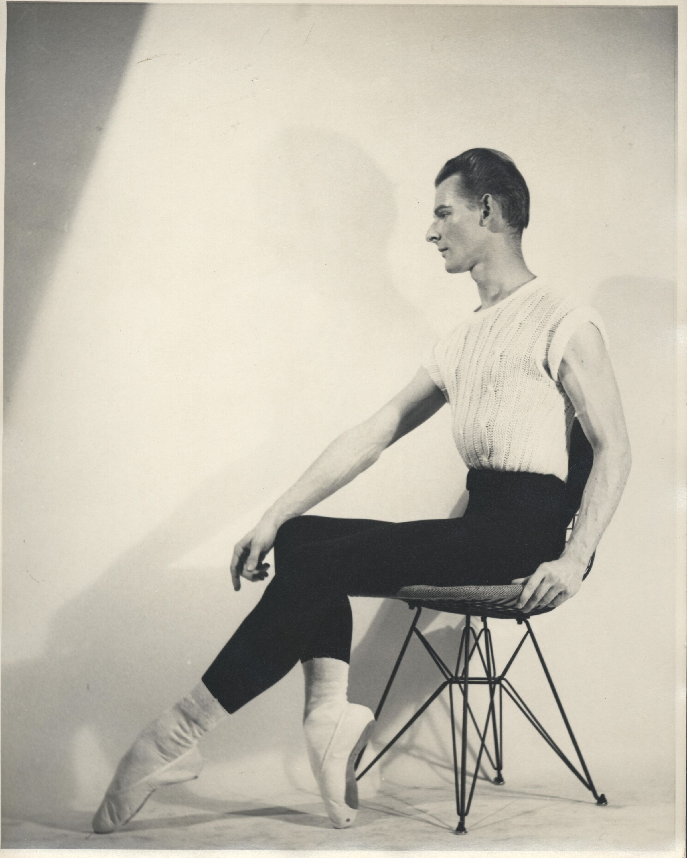Full body portrait of Paul Curtis, Jr., wearing his ballet clothes and slippers. He is seated on a 1950s-style chair in this profile image. In 1954 he founded the Los Gatos Academy of Dance, an organization that later became the San Jose Dance Theater. His own training began when he was a student of Los Gatos legend Betty McClendon. Between them, they taught Los Gatos to dance. The 1927 Los Gatos Armory building on Lyndon Avenue eventually became Curtis's dance studio. CUR042Collection