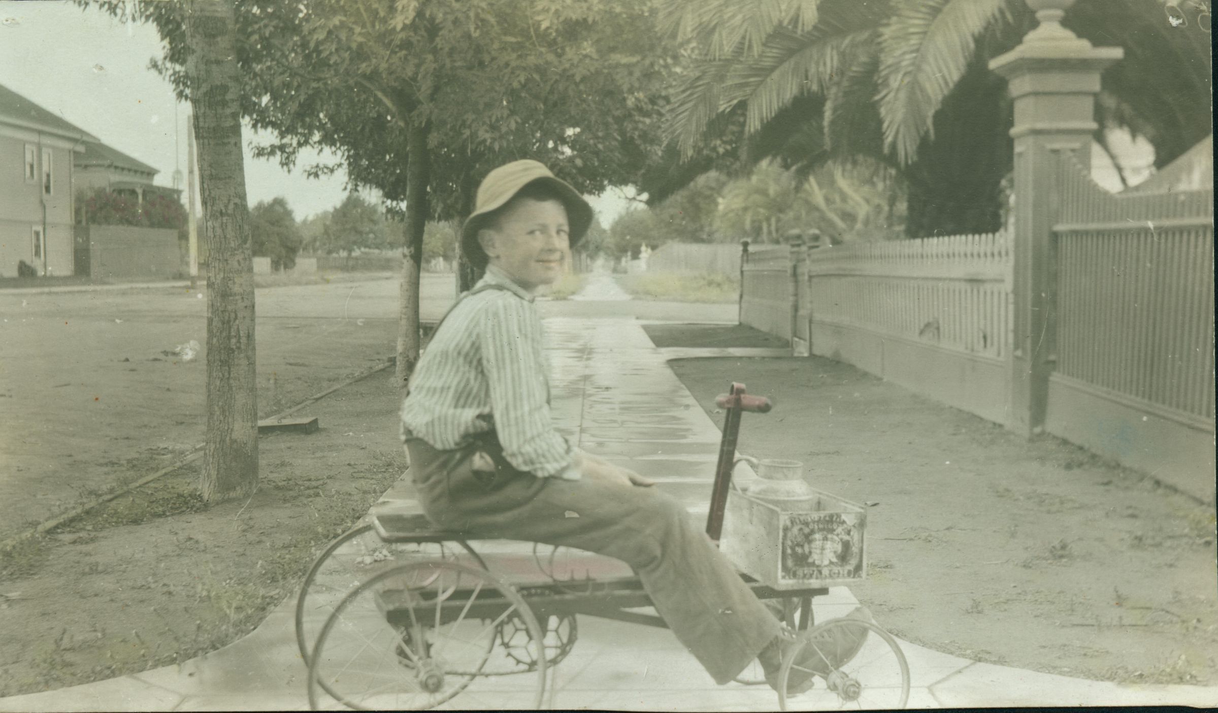Paul Simon (1884-1912) grew up on Tait Avenue, the oldest son of Southern Pacific engineer Peter Simon and his wife, Susan. Paul is pictured here around 1895 on his "Irish Mail" machine. A notable embellishment is the wooden box with a "starch" label. Paul died at age 28. SIM004Collection