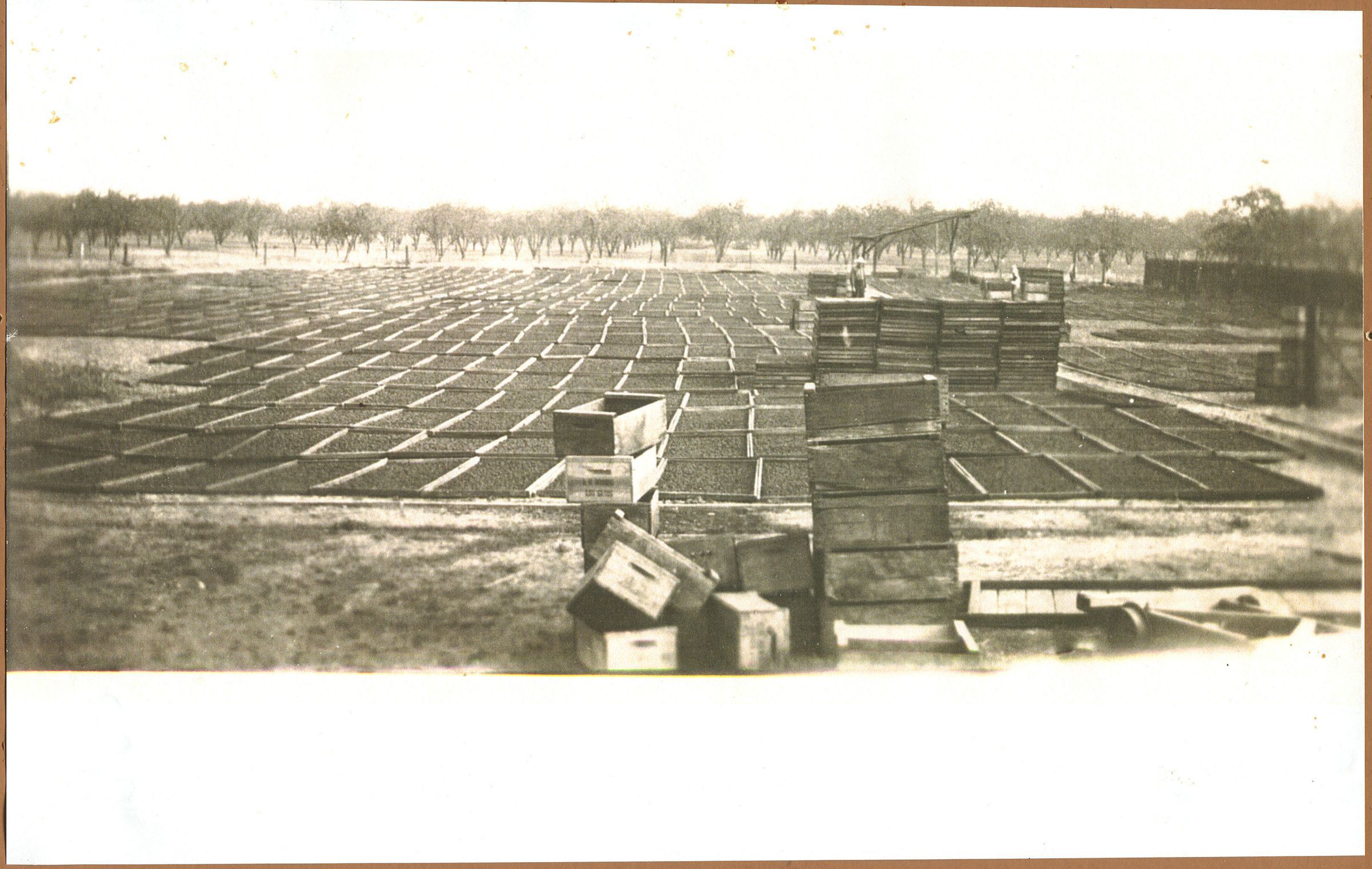 Peaches drying at ranch on National Avenue. Peach trees in background. FIN017Collection