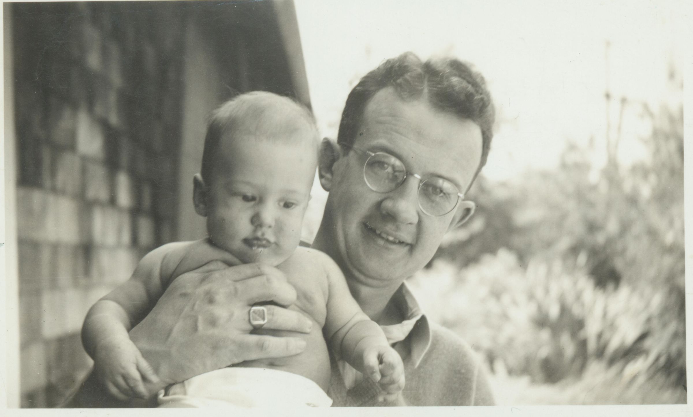 Peter Wilcox Balch, age 4 months, held by his father, Bill.They are at the Wilcox's house at the ranch in Santa Clara. BBC001Collection