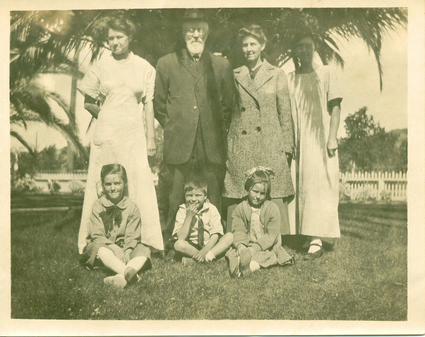Peter Rasmussen and his 3 girls - Left to Right: Carrie, Lena, Mamie. 3 grandchildren seated - Left to Right: Oline, Harry, Jessie.Collection