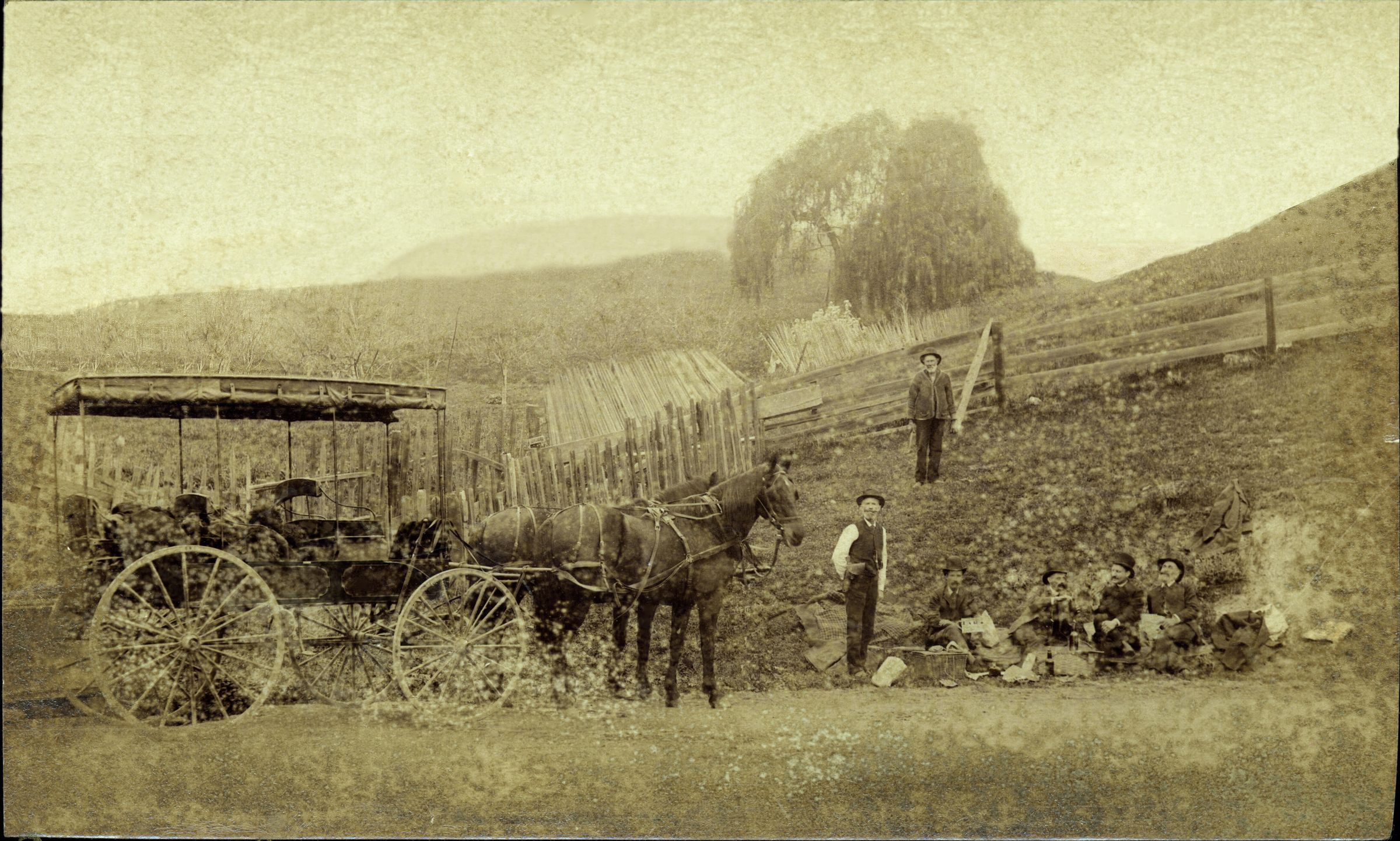 Men appear to be a group of friends from the local area who have traveled a few miles out of town for a picnic - complete with guns and bottles of whiskey. They hired the Los Gatos photographers Pierce & Cobb to record this moment for history. The presence of the liquor bottles may point to the fierce Prohibition battles that raged in Los Gatos for many years. The Los Gatos Board of Trustees was sometimes controlled by the 'wets,' and sometimes by the 'drys.' Newspaper reports indicate that in July 1889, a Prohibition ordinance went into effect, and caused some 'excitement' in town when the saloons refused to close. The 'saloon men' and members of the 'League of Freedom' from San Jose held secret meetings at the Los Gatos Hotel. On July 29, 1889, one of the saloon buildings in town was put on wheels and rolled to the town limits, where it opened for business. On August 5, 1889, the trustees repealed the Prohibition ordinance and fixed a license fee of $100 per quarter, with strict regulations, for the sale of liquor. PE196cCollection