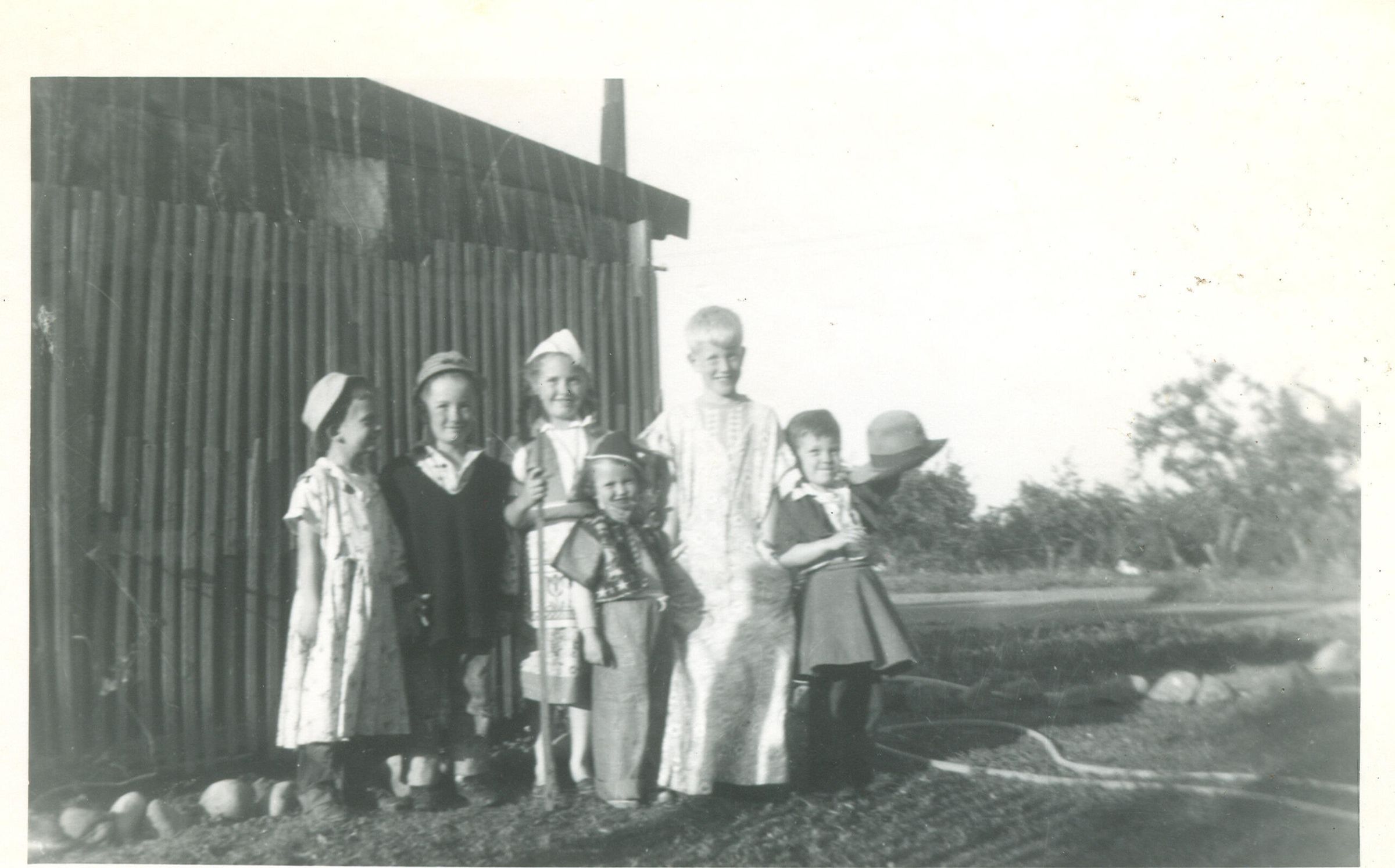 Chuck Bergtold, tall blond boy, with the Simpson children on the ranch at Placer Oaks, dressed for Halloween. The Simpson family lived on the Placer Oaks Ranch and were childhood friends of the Bergtolds. John Simpson worked for Jim Countryman's Oldsmobile-Cadillac dealership in Los Gatos and was a favorite of the local car buyers. BGF031Collection