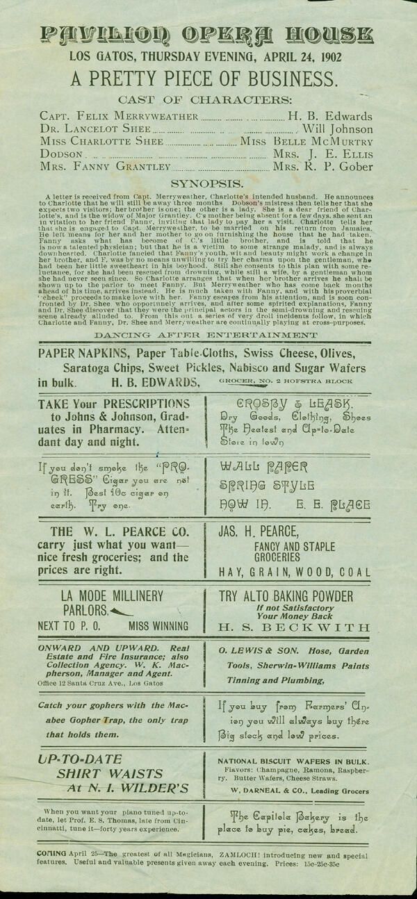 Playbill for the "Pavilion Opera House" in Los Gatos, Thursday Evening, April 24, 1902. The play was entitled "A Pretty Piece of Business." The cast included H. B. Edwards, Will Johnson, Miss Belle McMurtry, Mrs. J. E. Ellis, and Mrs. R.P. Gober. Playbill includes local advertisements. The "Pavilion" was part of the cannery at 41 North Santa Cruz Avenue. Two Los Gatos opera houses had burned to the ground, one in 1890 and one in 1894. Ford's Opera House was not constructed until 1904. AD032Collection