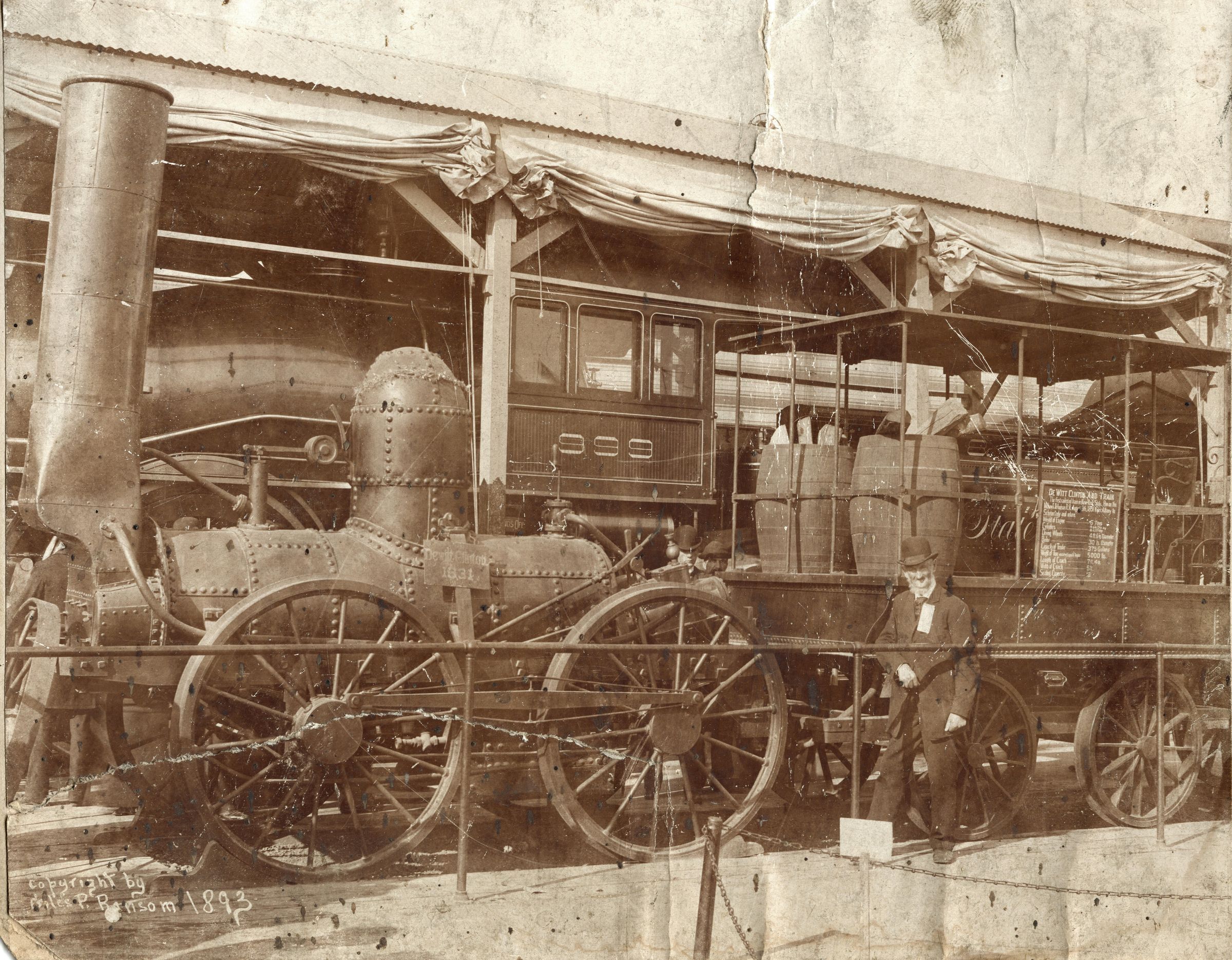 These trains were exhibited at the World's Colombian Exhibition of 1893 in Chicago. In the background is the New York Central and Hudson #999, the first locomotive in the United States to break 100 mph. In the foreground is the De Witt Clinton, one of the first stream locomotives to operate in the United States. It was built in 1831. It ran on the Mohawk & Hudson railroad between Albany and Schenectady, NY. It was the first locomotive to operate in New York State. FRA054aCollection