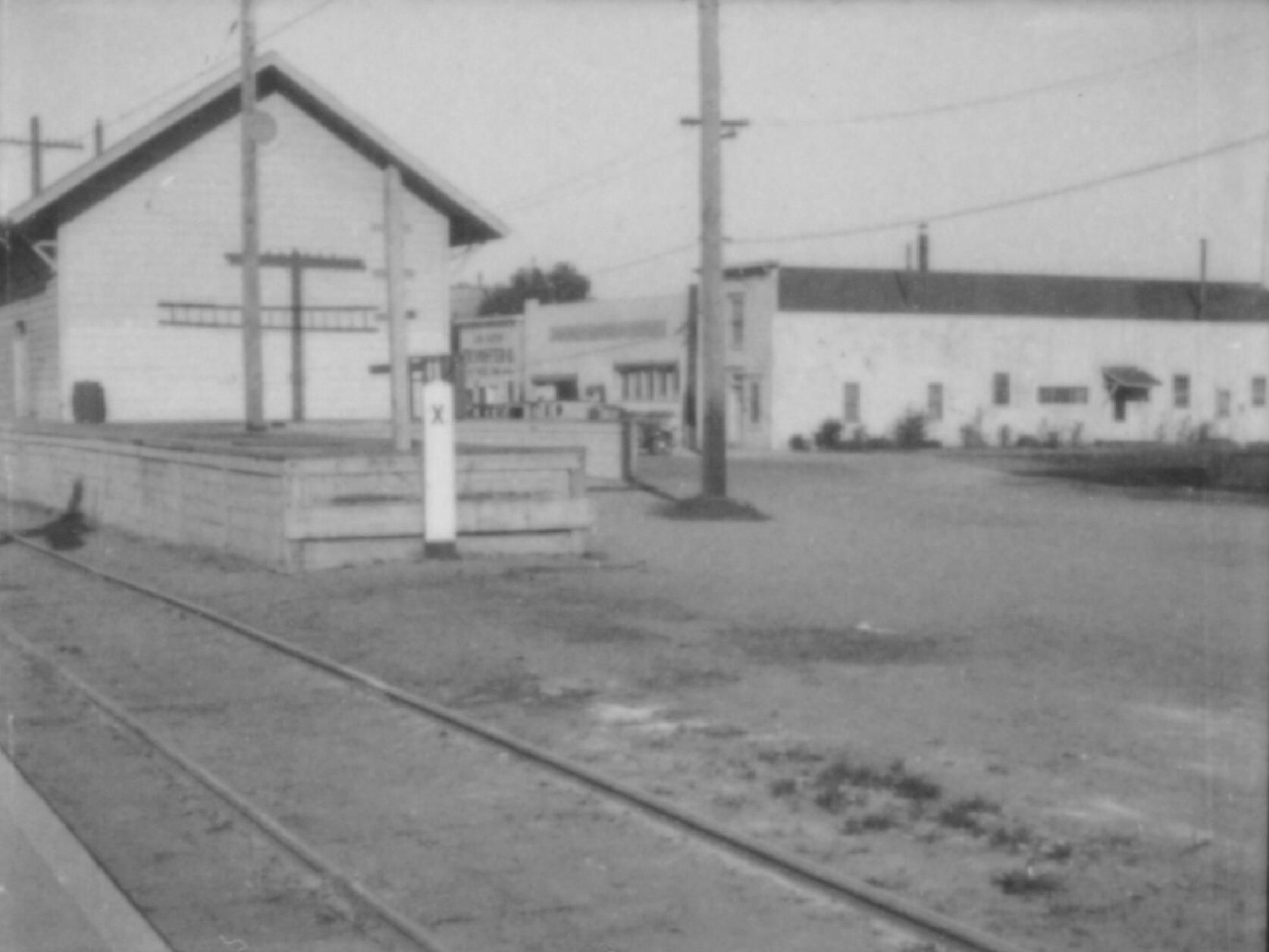 Southern end of the railroad depot in Los Gatos. commercial buildings on Front Street (now Montebello Street) in background.Collection