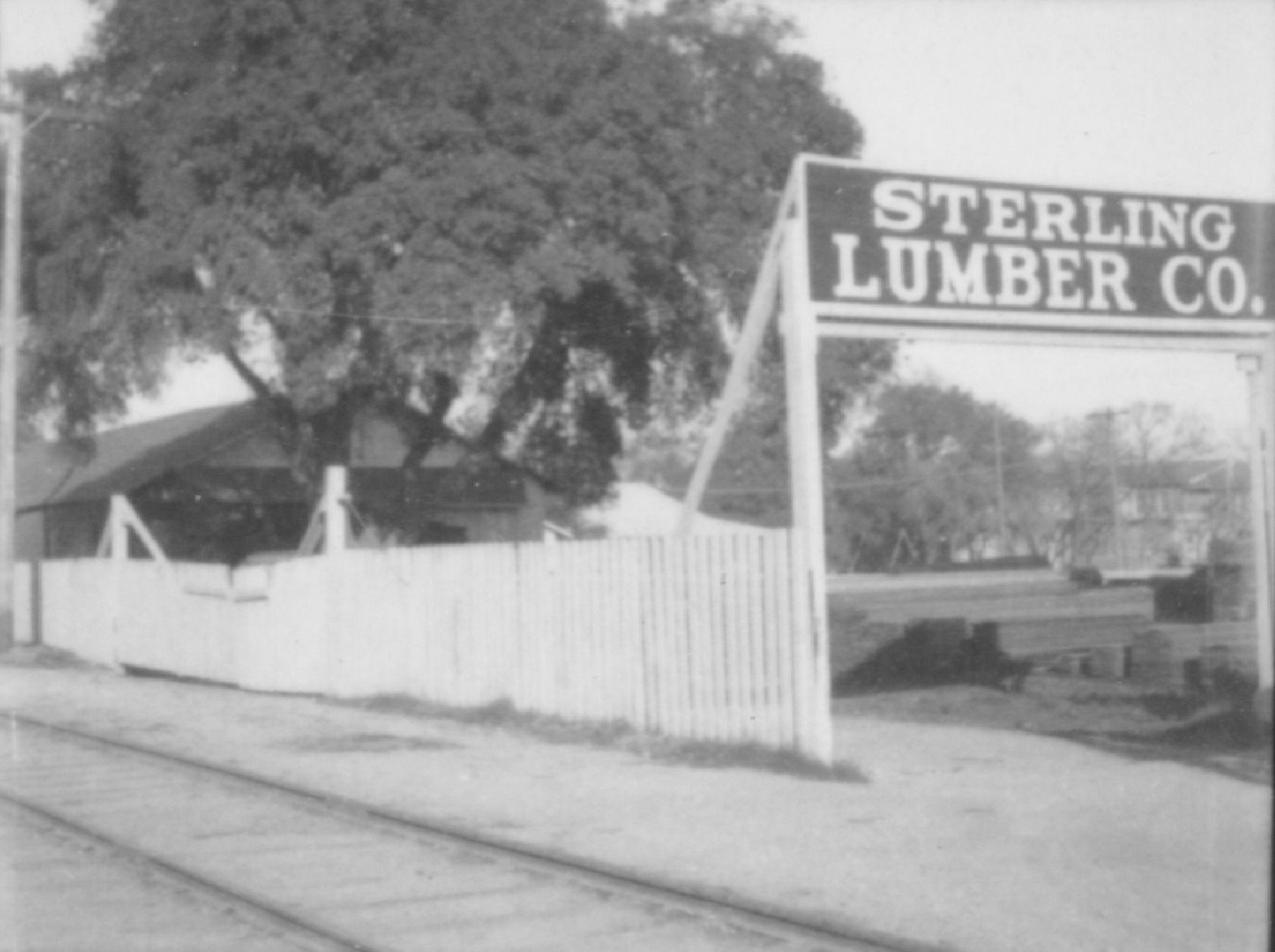 Back entrance to Sterling Lumber Co., along Southern Pacific Railway tracks, with University Ave. in background and University Avenue School showing through the trees.Collection