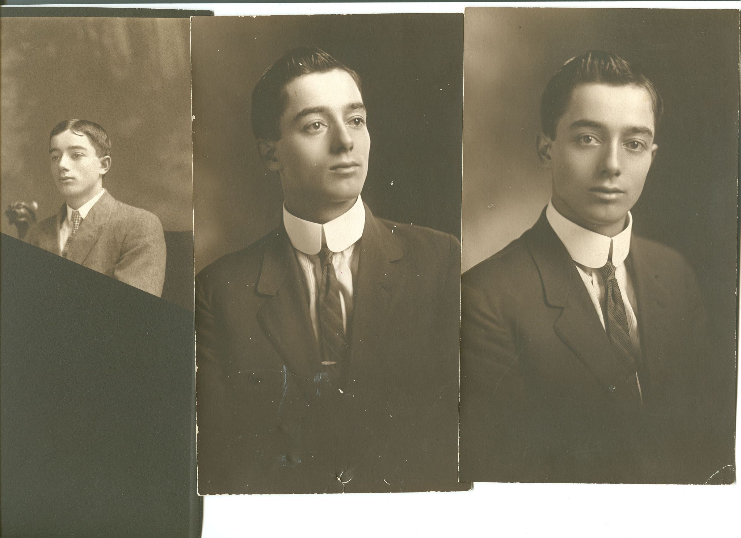 Three portraits of Raymond Zephyr Macabee as a young man. In the photograph at left, he appears to be speaking into a microphone. RID011Collection