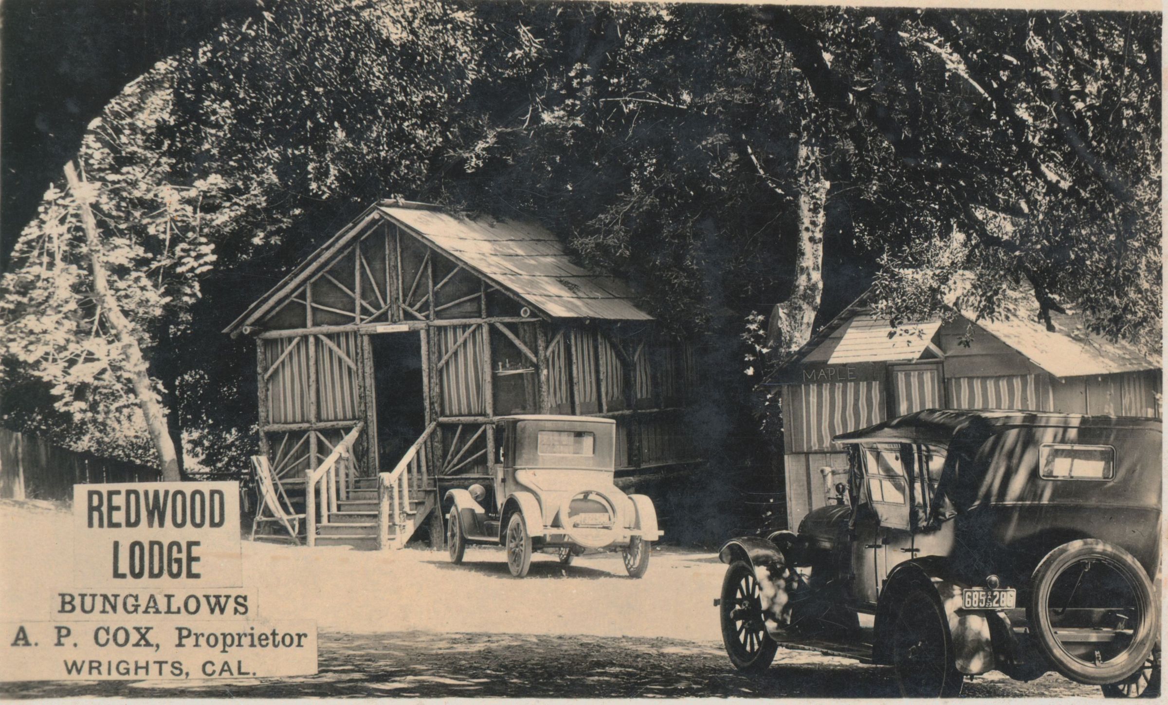 Postal reads,"Redwood Lodge, Bungalows, A. P. Cox, proprietor, Wrights, Cal. " MTN115Subject