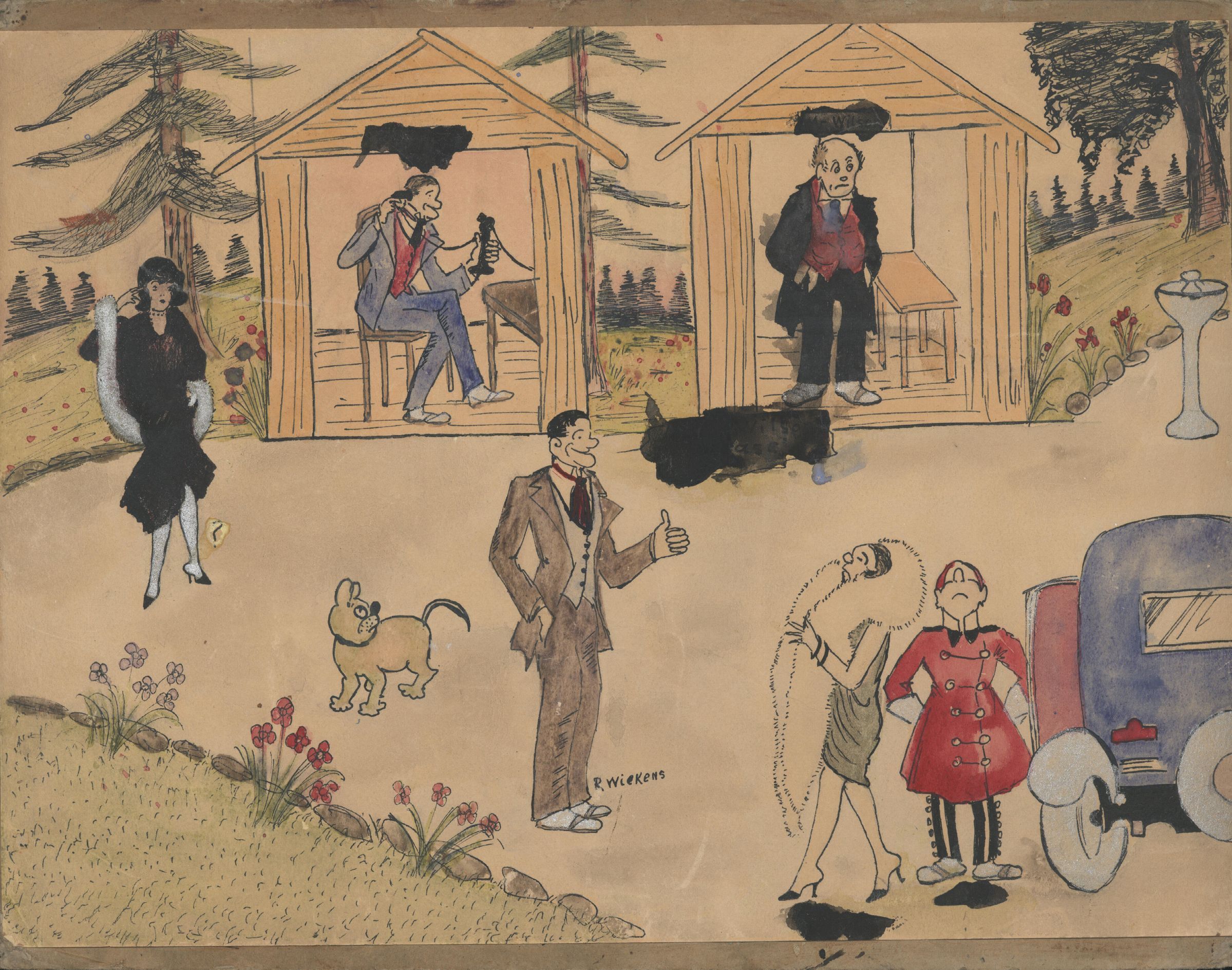 Cartoonish watercolor depicting the land sale at Redwood Estates. Paul Curtis, Sr. was the manager of Redwood Estates. The land had been owned by Gustav Heuter, a paint manufacturer from San Francisco, who maintained a country home on his "Mountain Springs Ranch," and grew wheat on the land. Unfortunately, Heuter was shot dead by his young wife Kate in 1905. The entrance to Redwood Estates on the old Los Gatos-Santa Cruz Highway was marked by a 15-foot high Dutch windmill. Many on their way to Santa Cruz stopped in and became land owners. CUR018Collection
