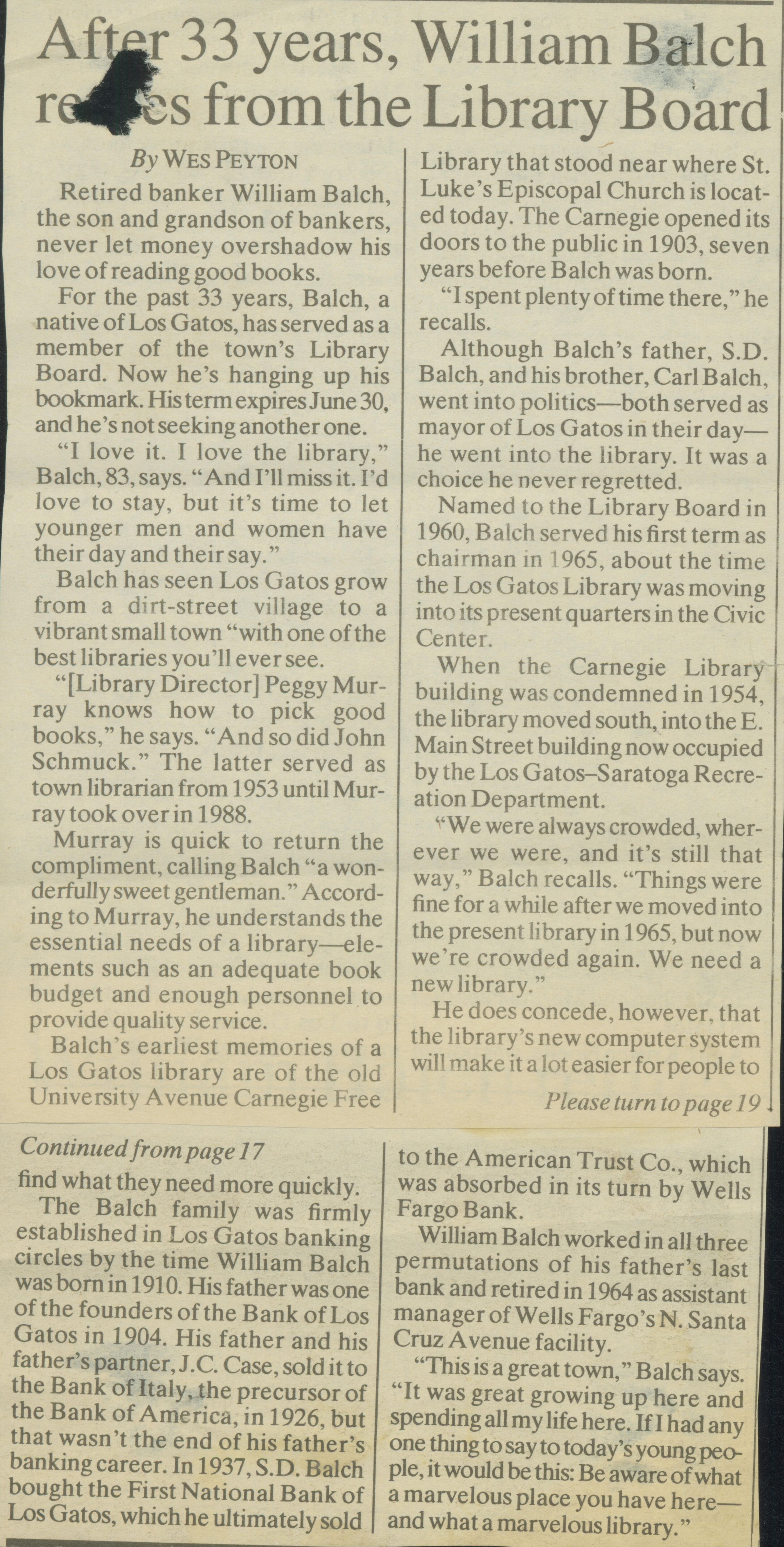 A news article in the Los Gatos Times describing Bill Balch's love of libraries and his long involvement with the Los Gatos Public Library. BBC075Collection