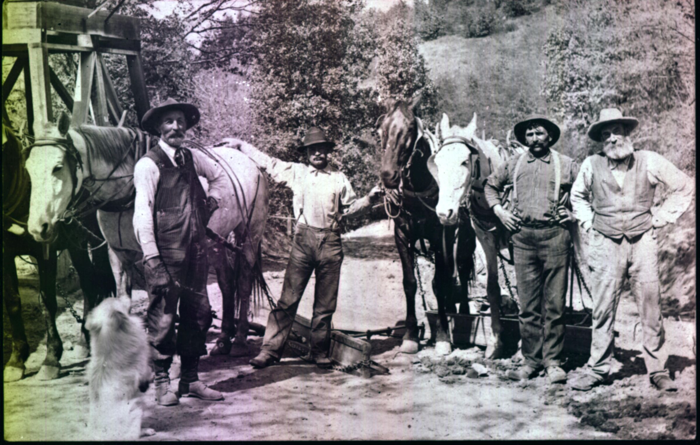 A road crew that maintained the old Santa Cruz road to the summit in the early 1900s. Charles H. Cook, road manager, is on the left. MTN074Collection