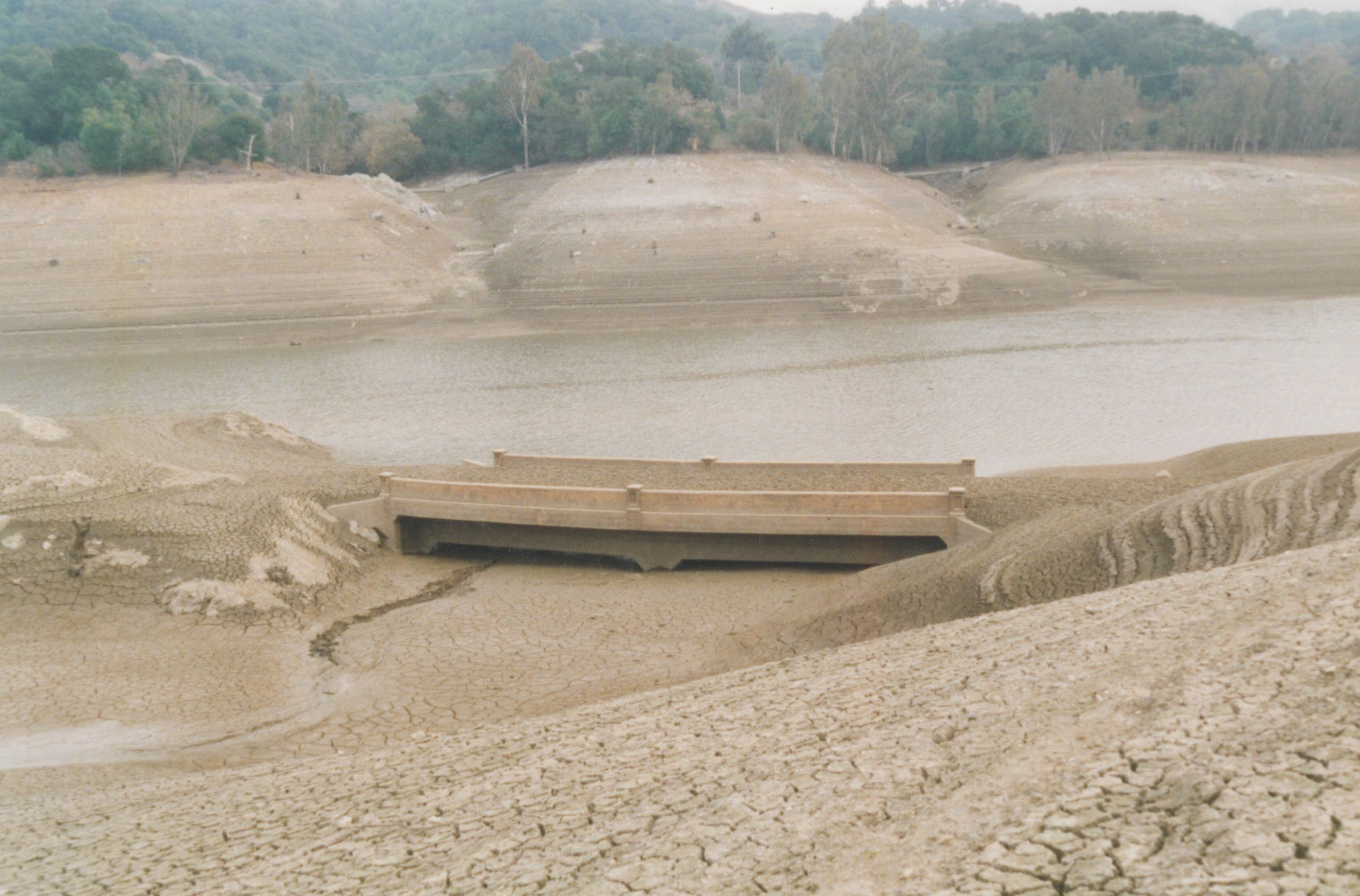 A view of the Alma automobile bridge which once spanned Los Gatos Creek providing access to the towns of Lexington and Alma. Since 1952 when Lenihan Dam was built the Los Gatos Creek, Alma Bridge and both towns became submerged by the rising water of Lexington Reservoir. The right-of-way of the South Pacific Coast (S.P.C.) and later the Southern Pacific (S.P.) railroad which ran adjacent to both towns also became became submerged. LEI049Collection