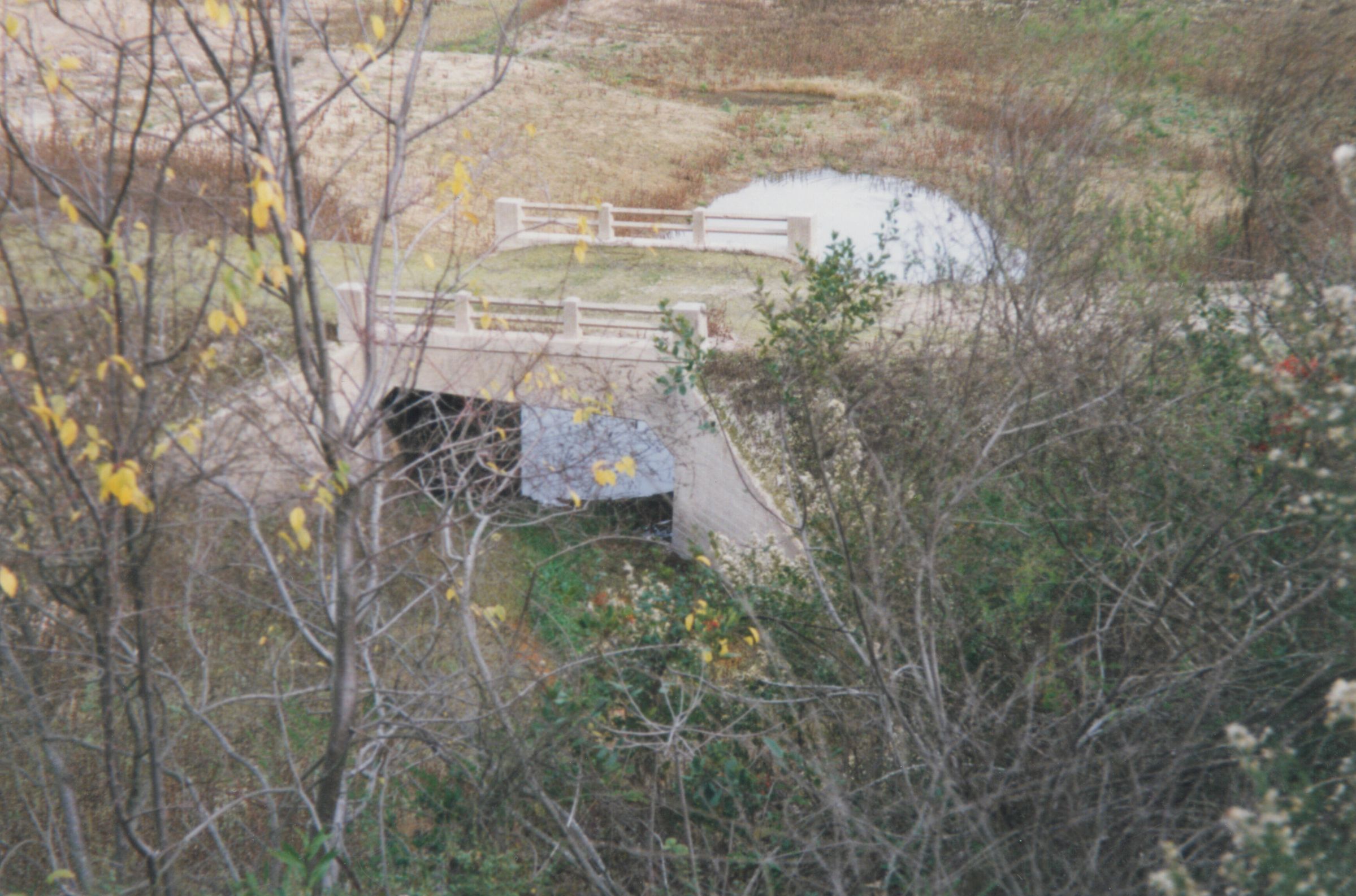 A view of an Old Santa Cruz Highway automobile bridge in the Lexington Reservoir basin where nearby ran the right-of-way of the South Pacific Coast (S.P.C.) Railroad and later the Southern Pacific (S.P.) Railroad. LEI051Collection