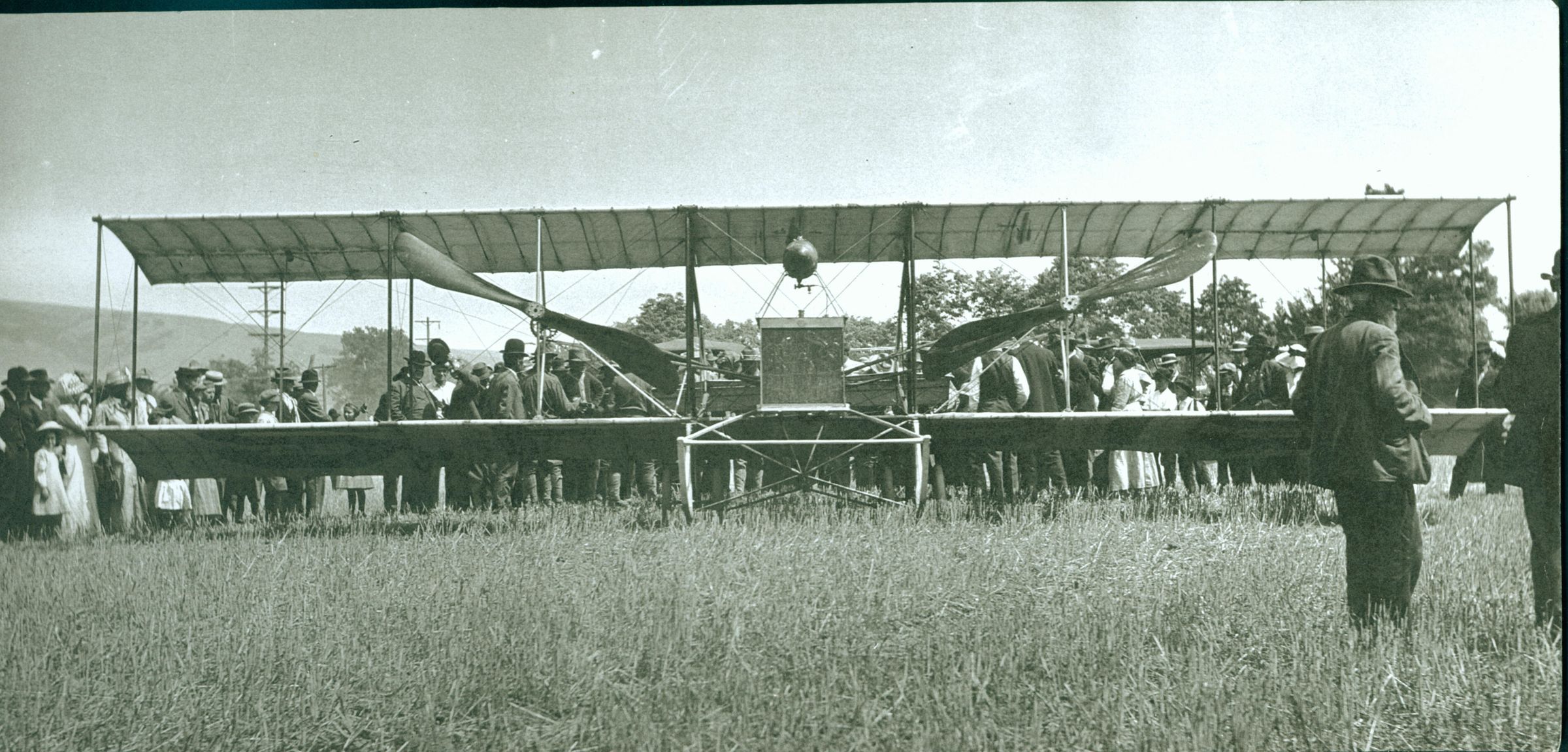 The "Roy Francis Airfield," owned by Bill Murphy, was on a plot of land at the northeast corner of the intersection of Blossom Hill Road and Union Avenue. A crowd has gathered to see this bi-plane. FIN060Collection