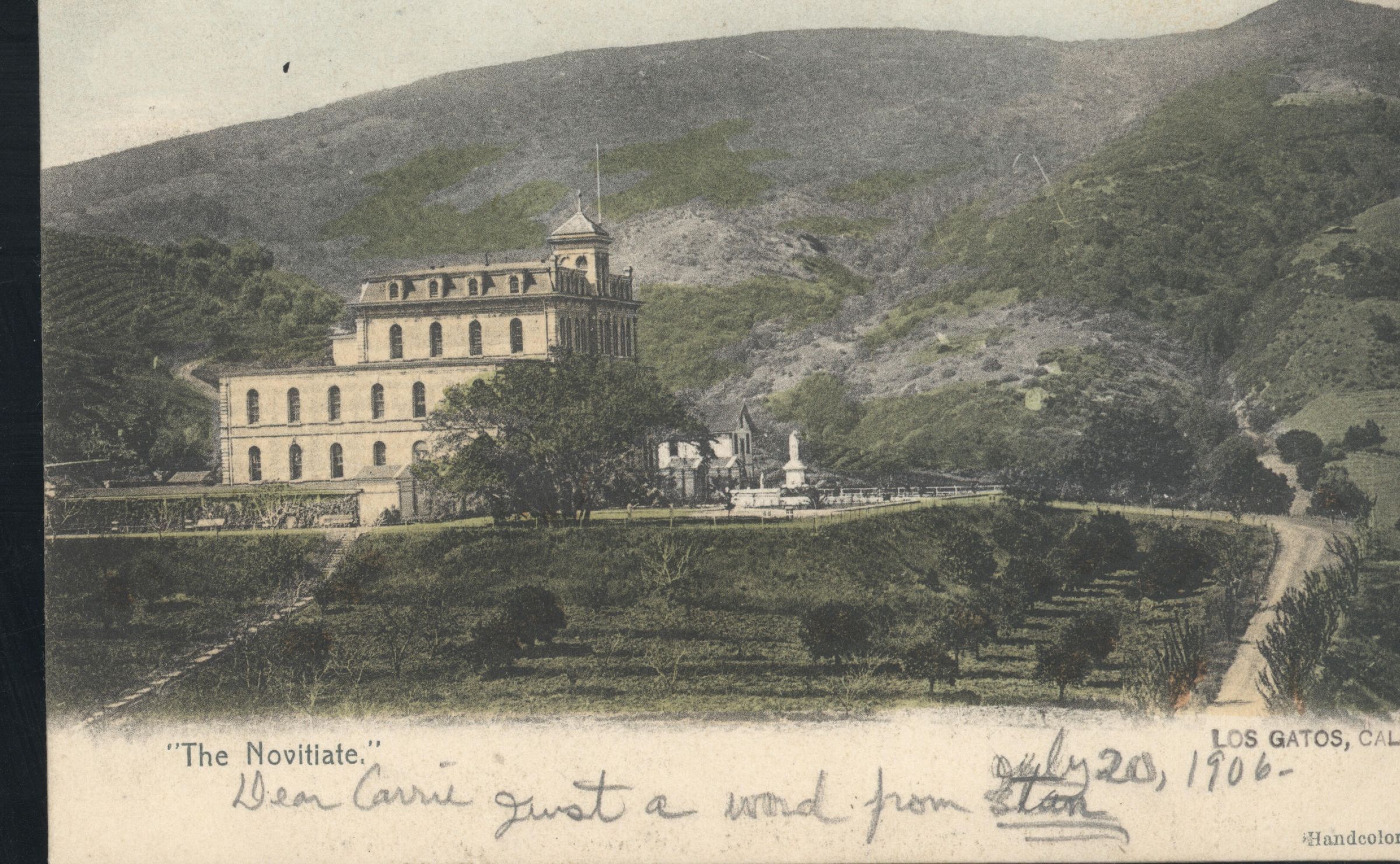 This postcard view of the Novitiate was produced before 1906. In the 1880s, the Jesuits chose the hills behind Los Gatos as an excellent site for establishment of a training center for novices. In 1886 they purchased the 40-acre ranch of Harvey Wilcox, already planted with orange trees and a small four-acre vineyard. The original winery was a wooden frame building constructed in 1888, followed by a large cement structure in 1893. By the mid-1890s the Novitiate was producing a variety of table and dessert wines from many grape varieties. NOV003Subject