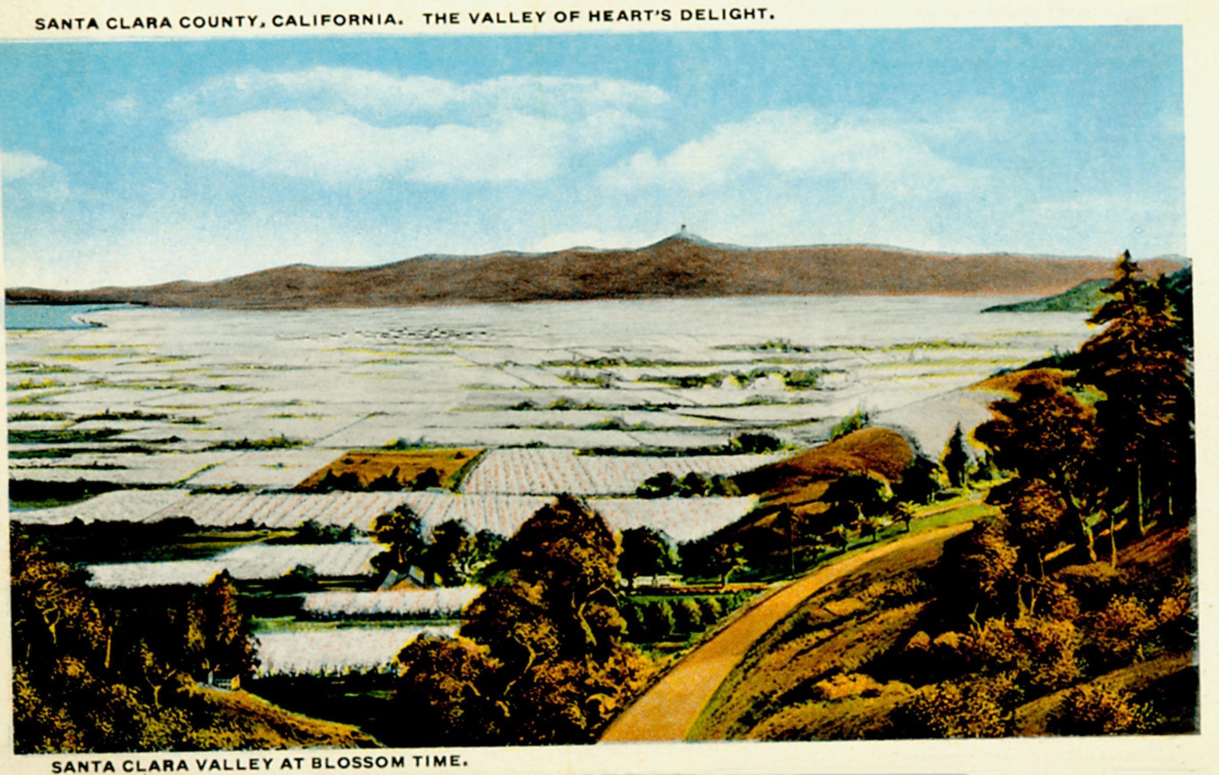 The whole Santa Clara Valley was a blanket of white and pink blossoms in the springtime, as this postcard shows. Across the valley is the Lick Observatory. BER007Subject